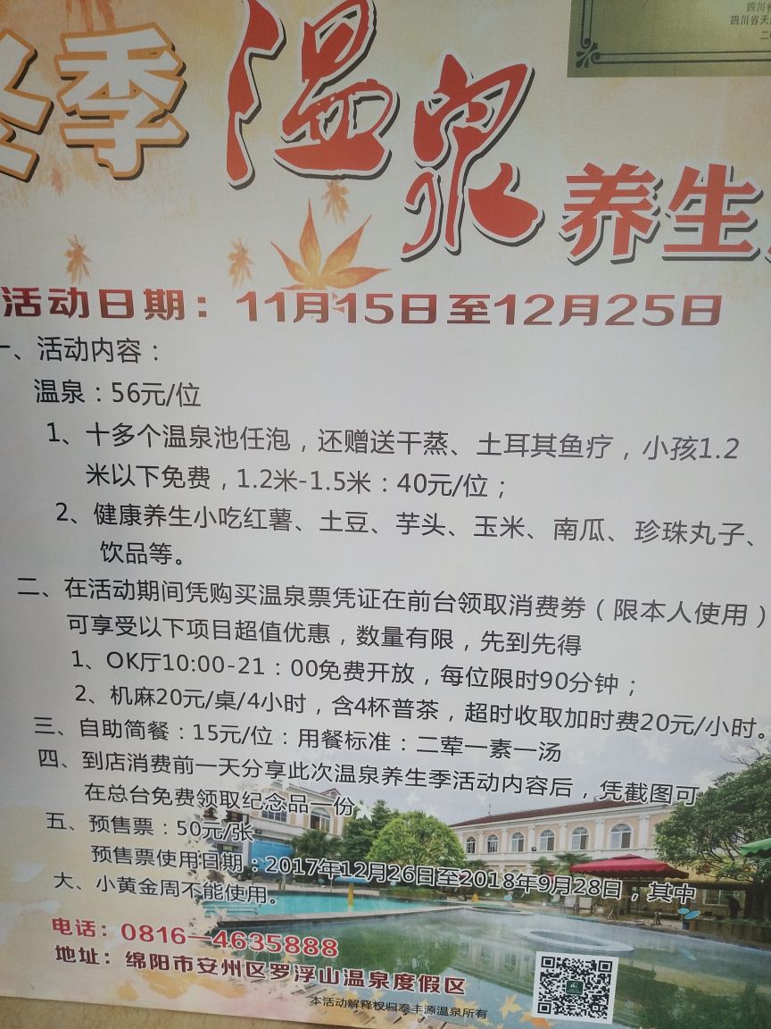 网友2017-12-10有免费养生小吃,温泉池也有十几个。很好。价格便宜实惠。值得一去。还有免费鱼疗。下次还带朋友一起来玩很好。价格便宜实惠。有免费养生小吃,温泉池也有十几个。水温好。还有免费鱼疗。值得一去。冬季好去处。下次还带朋友一起来玩!