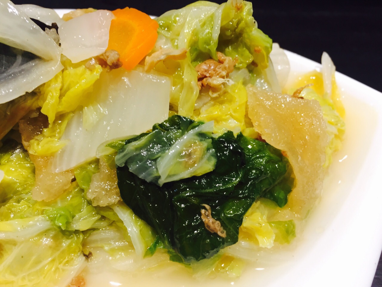 白菜里好像加了特有的酱,有点海鲜的味道,不知道是不是xo酱,非常入味很好吃。配上黄瓜,腌渍萝卜解腻