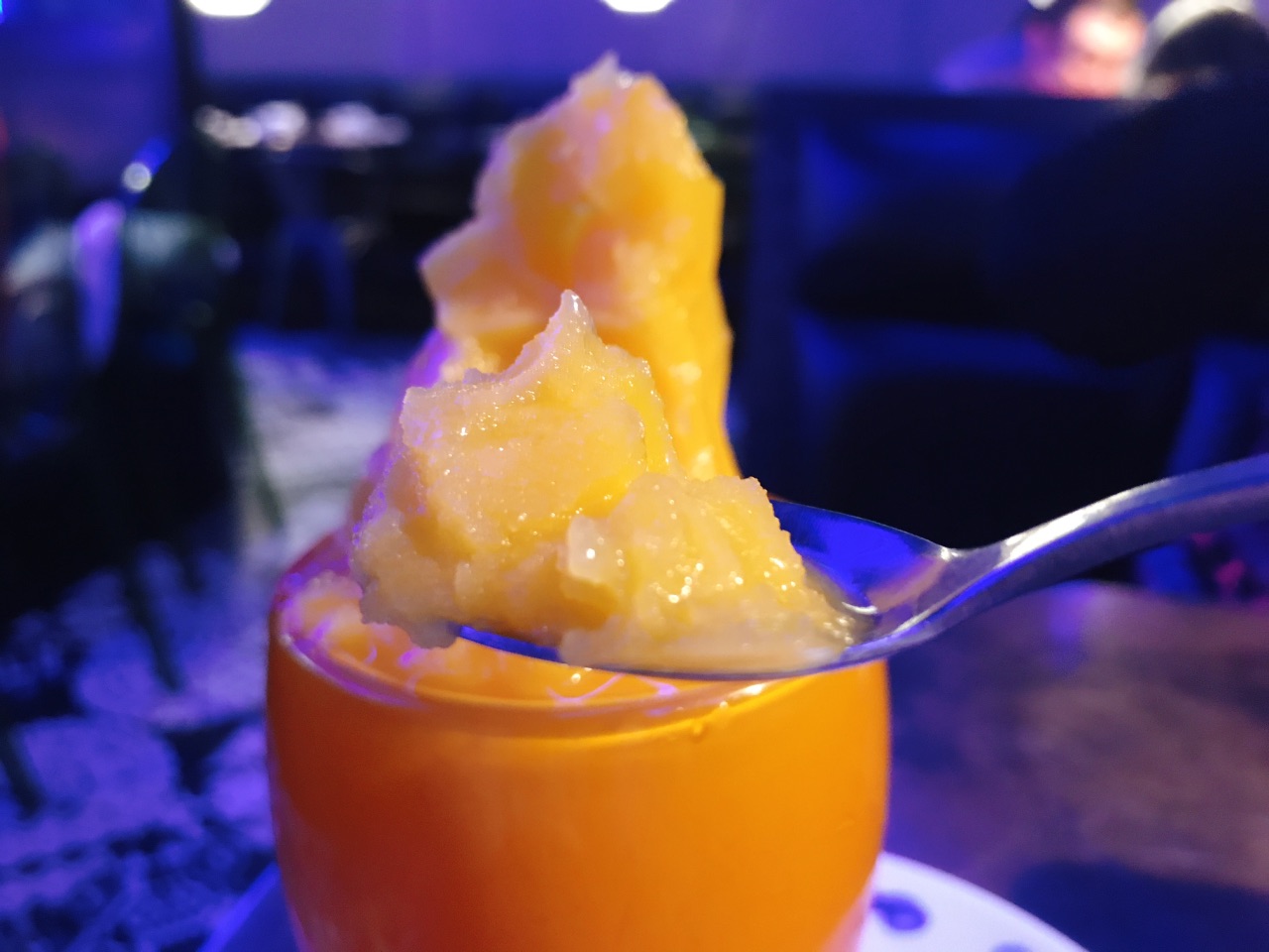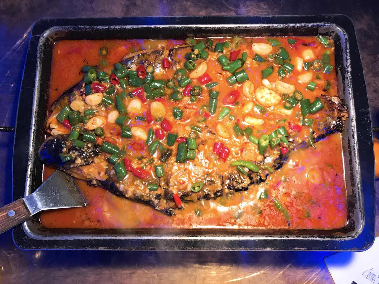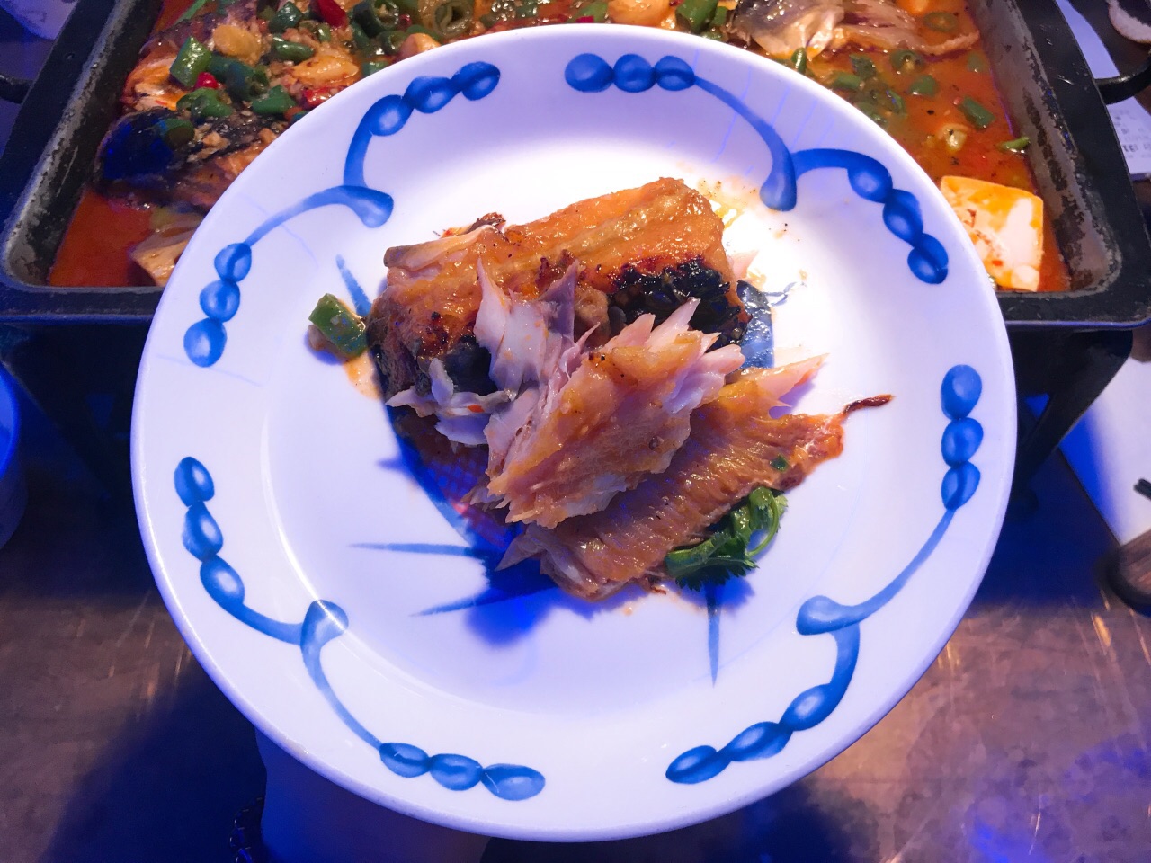 恒隆里两家吃鱼的店紧挨着 想带父母吃浓香烤鱼就来了这一家 菜单非常清楚的画出可选鱼的形状 标注了净重 有19种口味可以选择(太难取舍了 都好吃) 这次选了店家推荐 不辣的 蒜香味 鱼选择了湄公鱼 肉厚刺少 并非活鱼现杀 鱼肉经过腌制部分呈粉色 味道渗入鱼肉中了 选择了三种配菜 豆腐 时蔬(小白菜)藕片 想自己控制加菜的顺序 上菜时没让铺提前在下面 暴露了菜量小 菜不够新鲜 切出的菜明显沾了其他菜品碎屑的缺点 甜品选了黄金瓜 就是蜜酿南瓜块(热的) 桌桌必点的芒果冰沙比较实惠了 和外婆家餐饮属于同一企业 店内装修地板餐具风格都非常相似 美中不足的就是这个装修风格和昏暗的室内灯光 不容易看清菜品本身的颜色