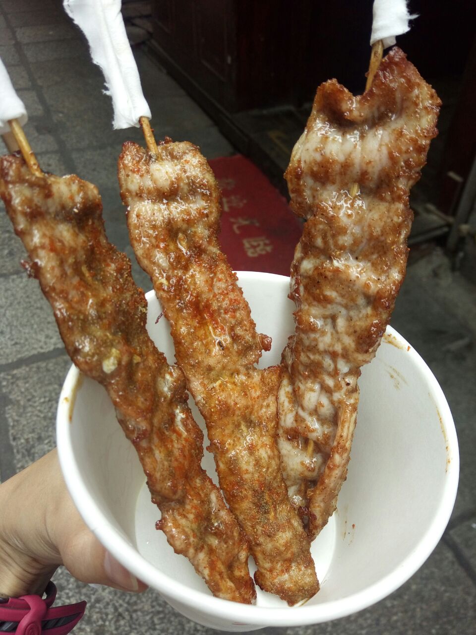 又是一家团购消费后没点评的漏网之鱼嘛! 这家店就在鼓浪屿上面,我们4个小伙伴是分头行事,因为一个小伙伴在小店开蚌取珠做珍珠手串,需要一些时间,我们都有点饿了,那我和另一个小伙伴就去觅食了。 去厦门怎么能不吃沙茶里脊肉呢?一人一串买好,团购3.5元一串,直接买是15元4串。 给个小杯子装的,洒点辣,味道真不错。