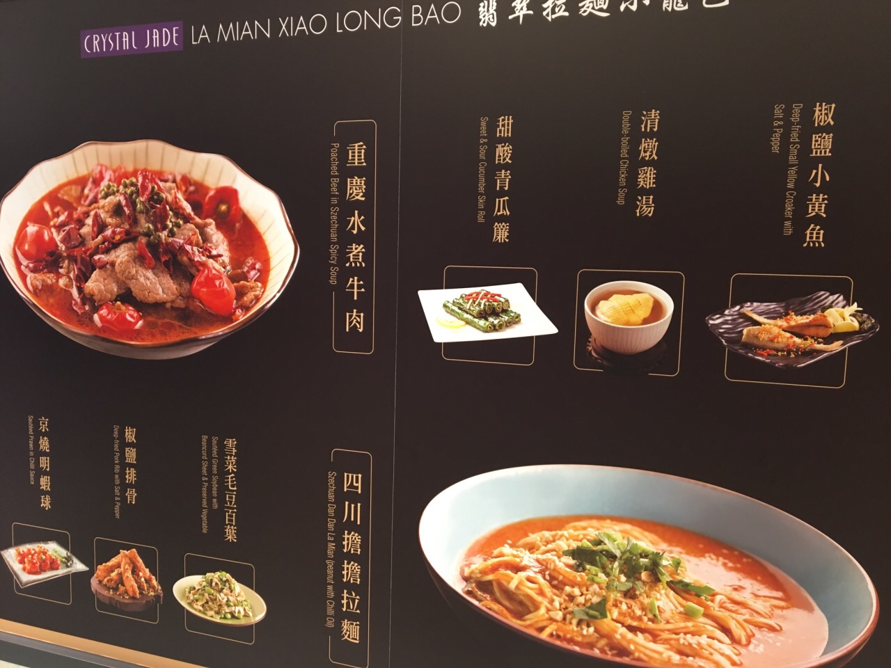 金钟廊顾名思义其实就是一个长长的空中长廊。在这个长廊里面有很多的购物店,也有不少的餐馆,翡翠拉面小笼包在比较靠近通向太古广场的方向。之前在机场吃过翡翠拉面小笼包,当时可能是时间比较紧张,只注意看了面点和小笼包的选择,来到金钟廊才认真的看了一下菜单,才发现居然还有重庆水煮肉片这样的菜色,虽然说劲辣的感觉肯定是不像在四川和重庆吃的那样,但在香港能够这样解解馋也是很不错的了。