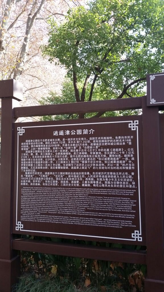 位于合肥老城东北,免费开放,由水系分为东西两园,园址古为淝水上的一处津渡、三国时的古战场,园名缘于《庄子》的名篇《逍遥游》。 园内有张辽衣冠冢、梅花山等景点,面积不大,冬季来就是一街心公园,外地游客如时间不宽裕,可不列入行程!