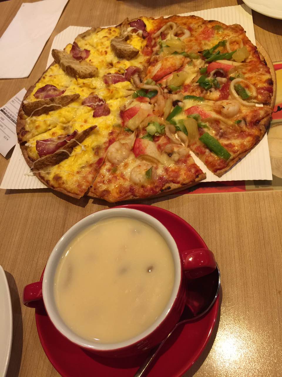 新推的博饼披萨非常好吃!蜗牛一如既往地赞,美中不足的是千岛酱和意式蔬菜汤居然没有!