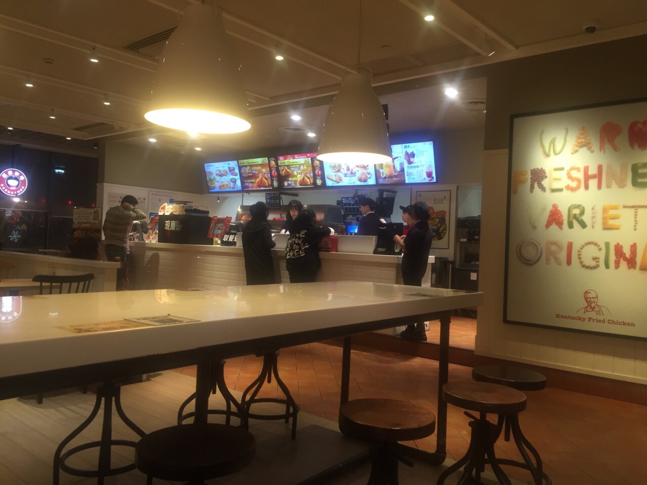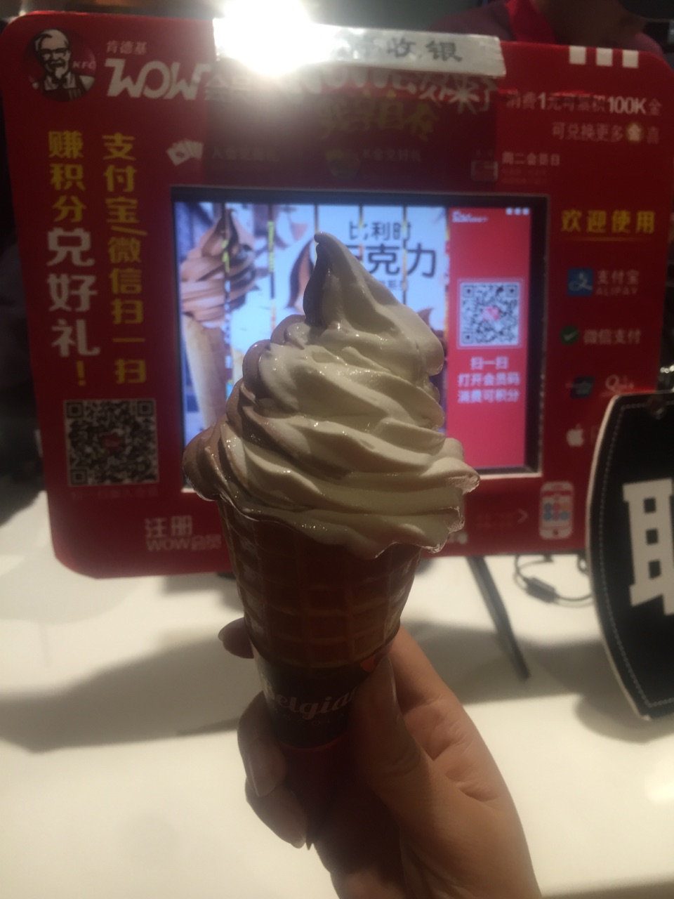 在等回家的顺风车的时候,外面太冷,在肯德基里躲躲,吹吹暖气。有个服务员朝我看了几眼,大概在想又来了个蹭空调的吧。有点不好意思了,看到旁边桌小朋友手里的双炫冰淇淋甜筒很诱人,过去买了一个,怕冷,又买了杯热拿铁,名副其实的冰火两重天啊。