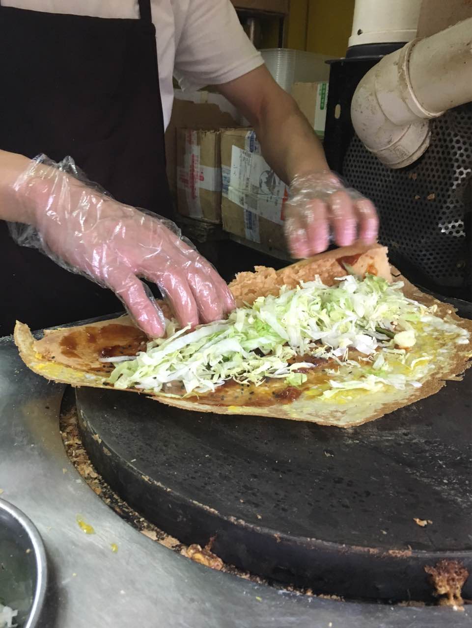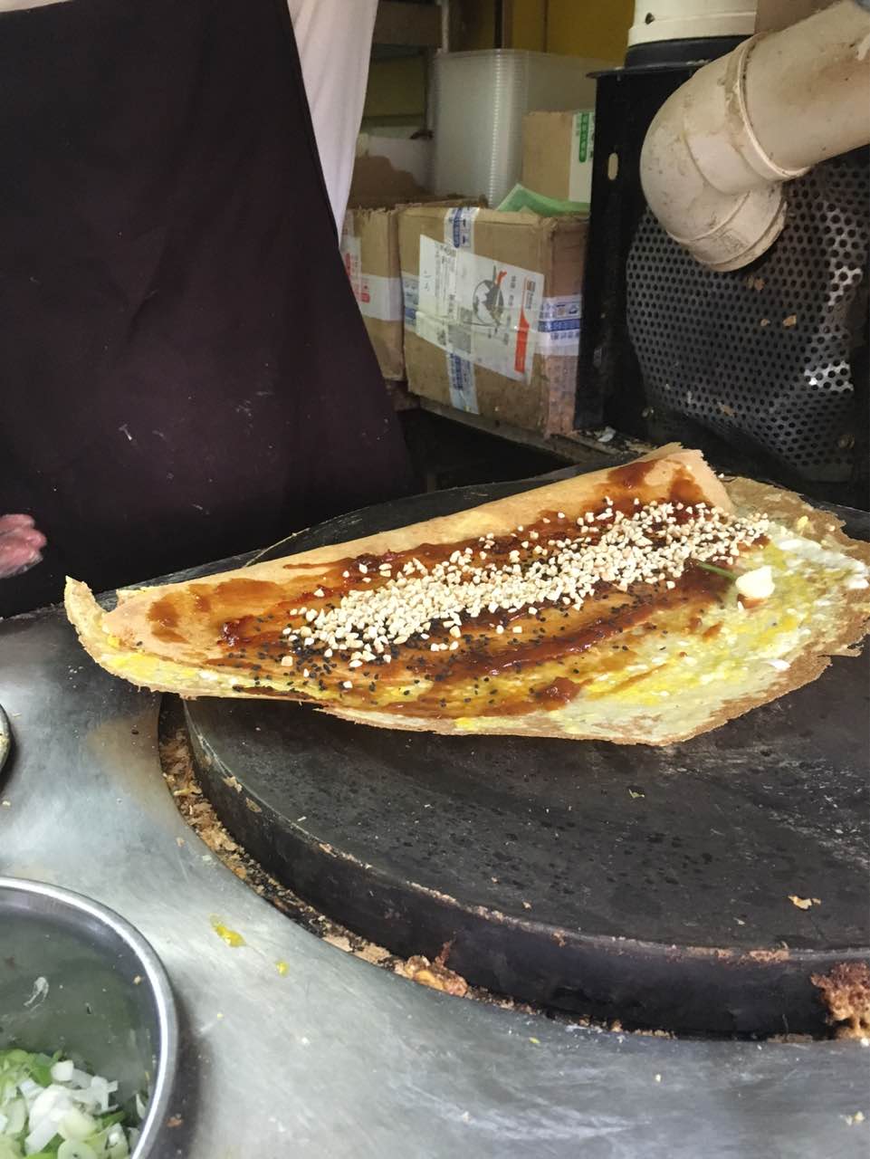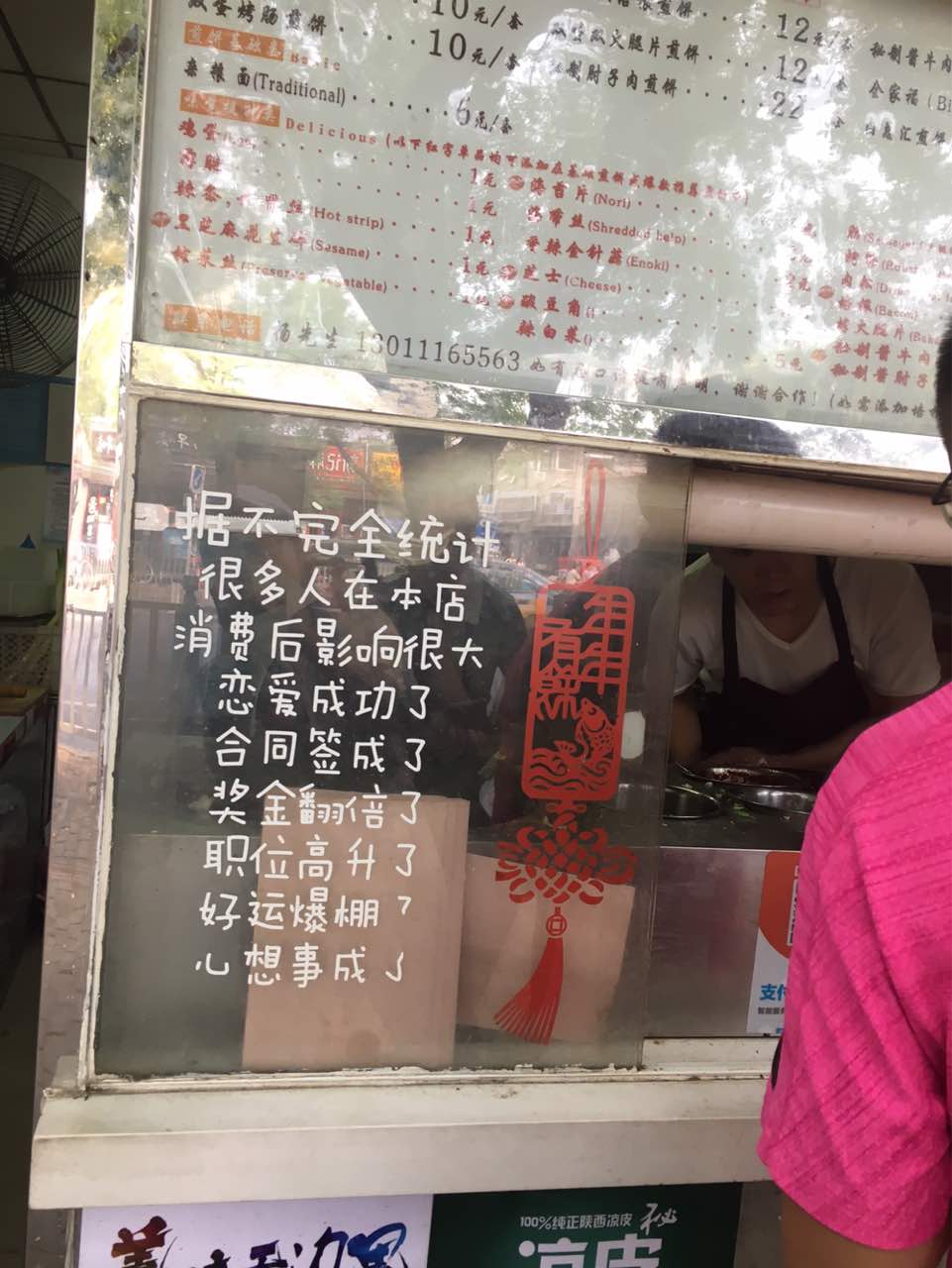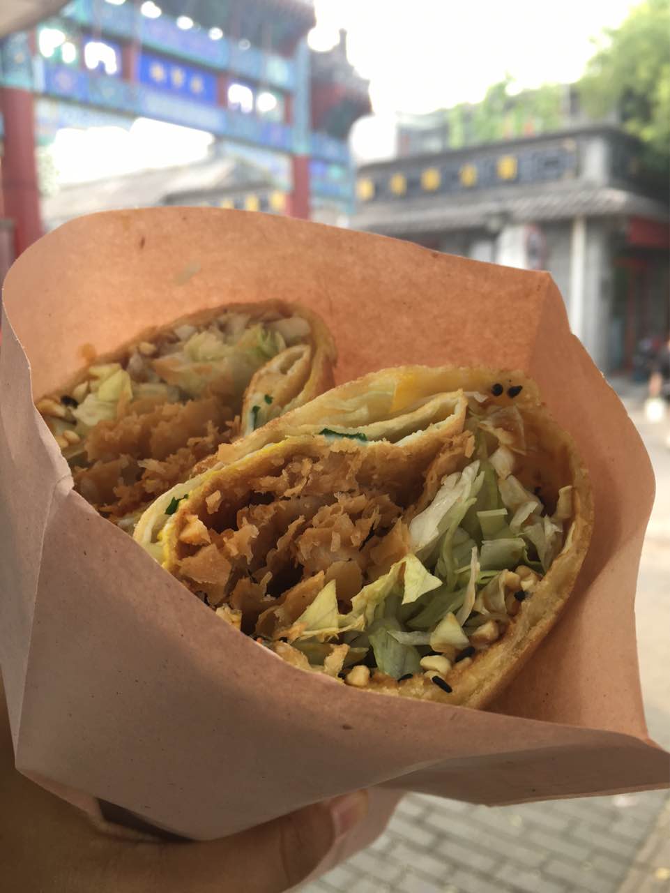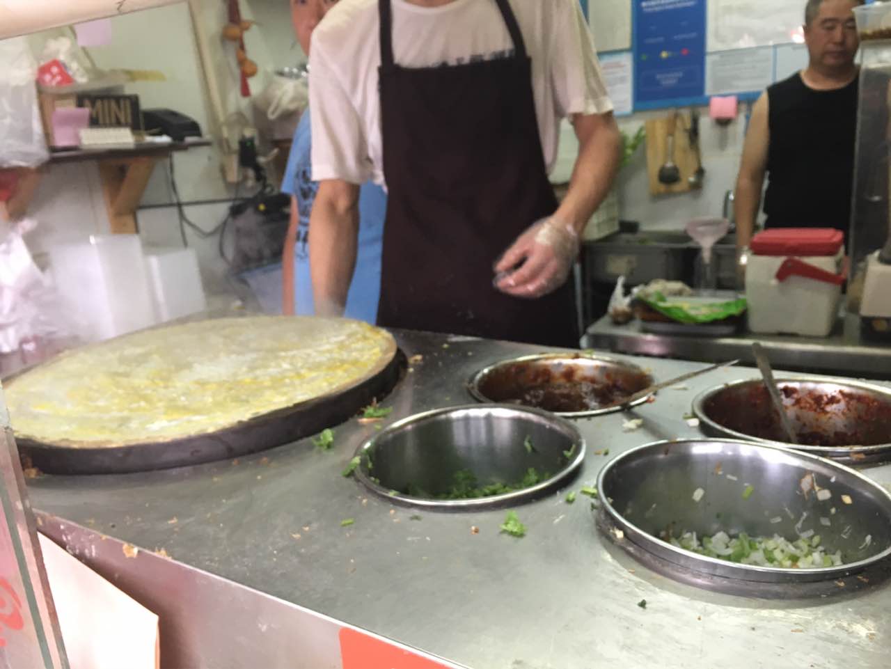 杂粮煎饼加黑芝麻花生碎,外加一瓶现磨热豆浆,共10元~小店很火,要排队哦~