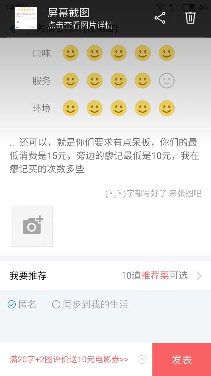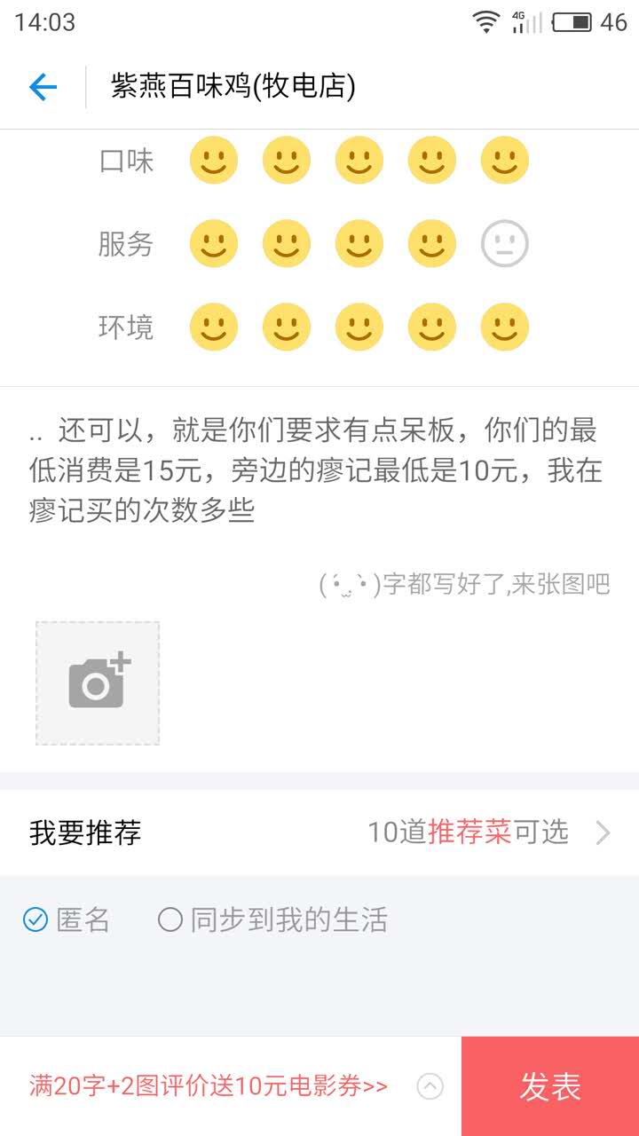 网友2016-12-17还可以,就是你们要求有点呆板,你们的最低消费是15元,旁边的瘳记最低是10元,我在瘳记买的次数多些.. 还可以,就是你们要求有点呆板,你们的最低消费是15元,旁边的瘳记最低是10元,我在瘳记买的次数多些