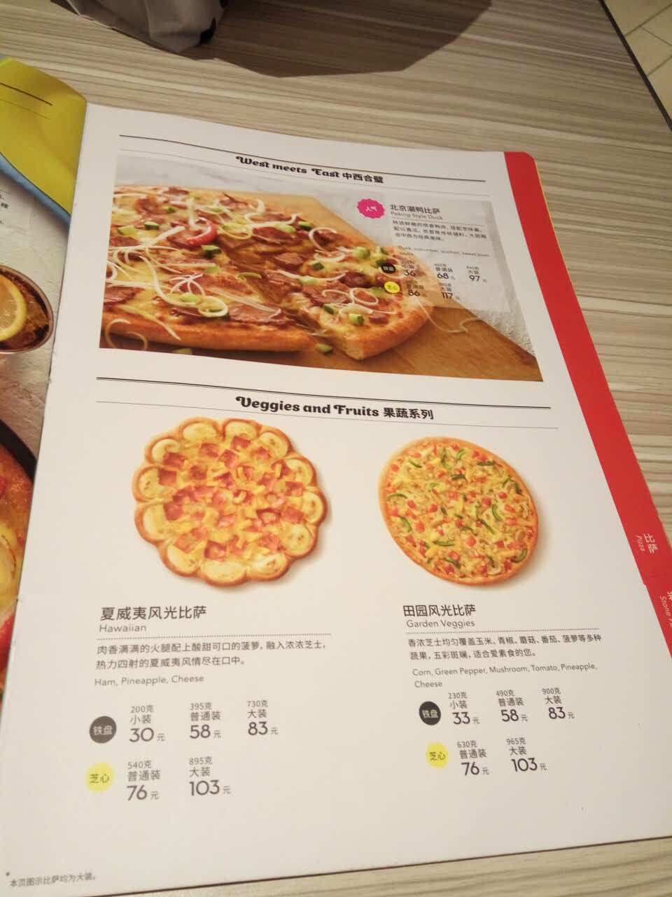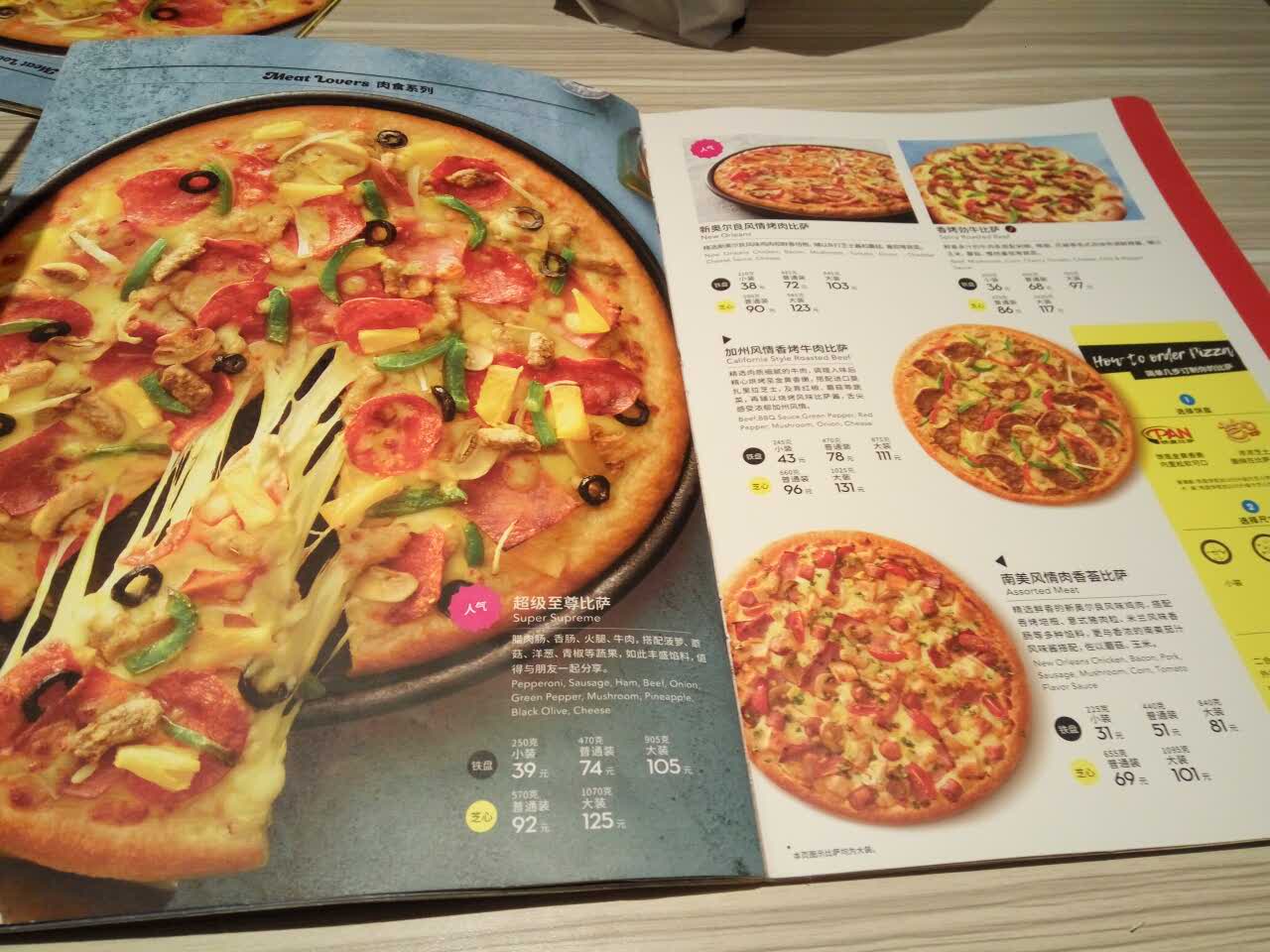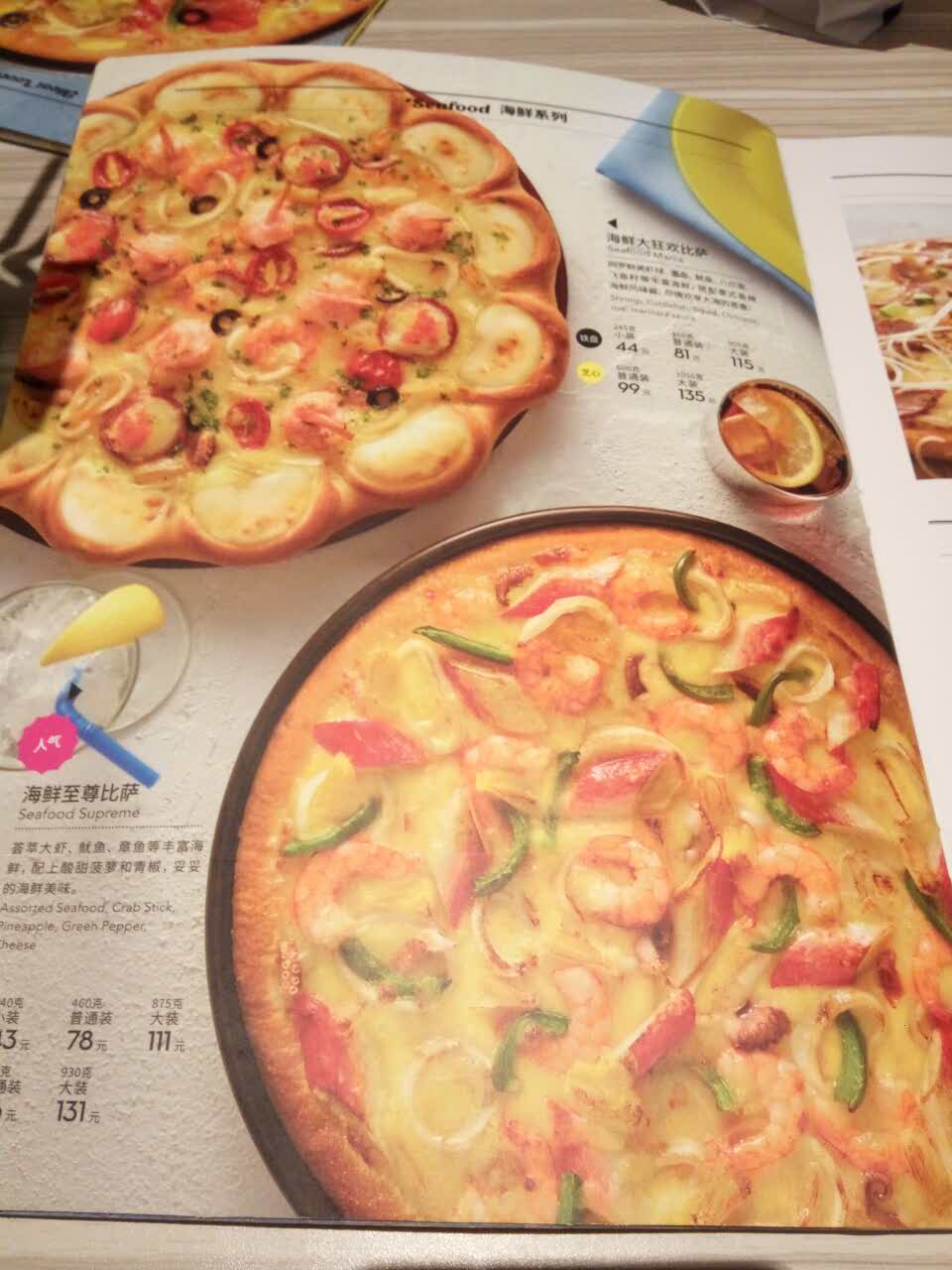 点了海鲜披萨,味道很好,没有普通装的,点了芝心的99元的那款~跟图片差不多,虾很大,味道挺好的~