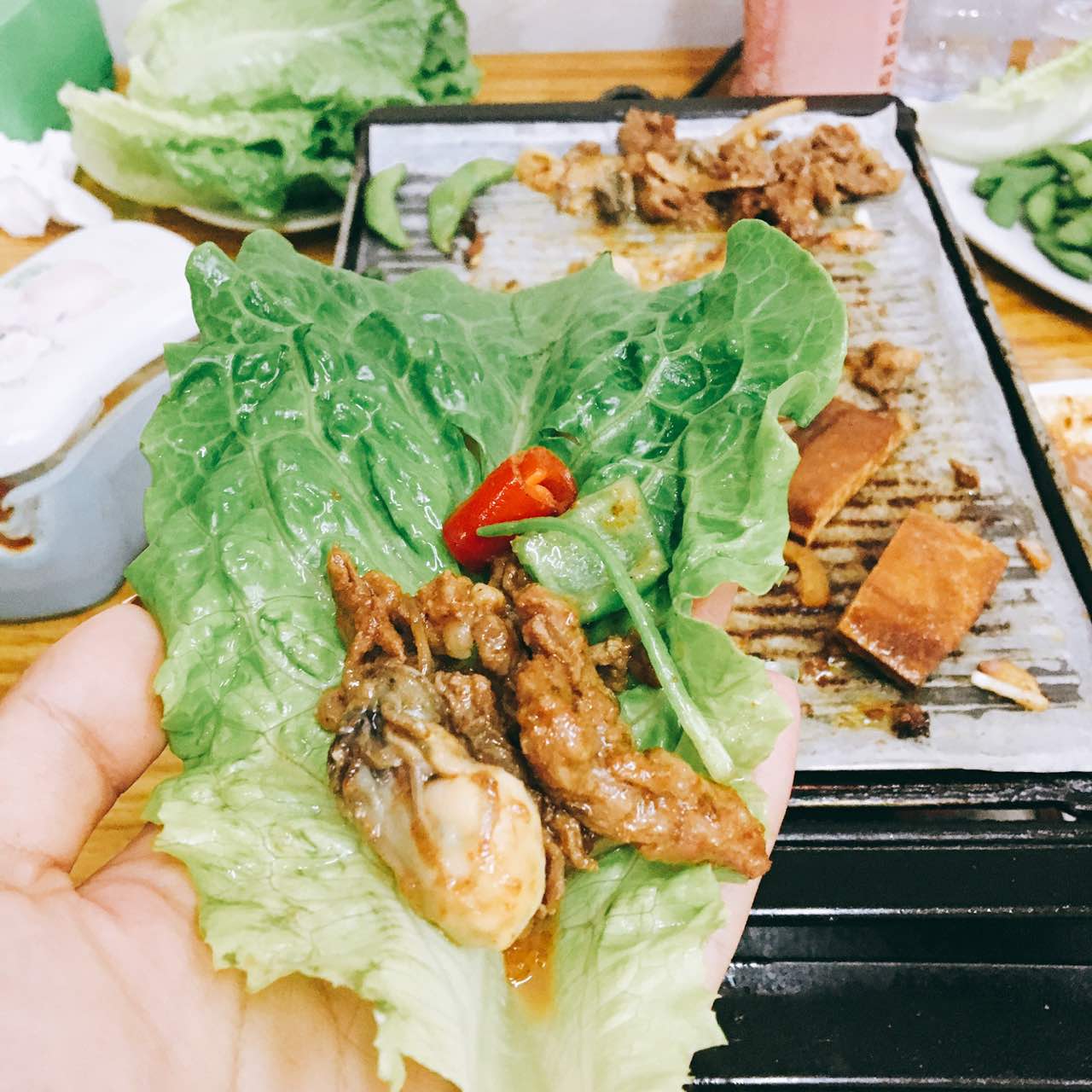 推荐牛肉,五花肉,海蛎,生菜,鸡软骨,吃的时候海蛎配上烤肉,再加辣椒,鲜美爆汁口感超好!