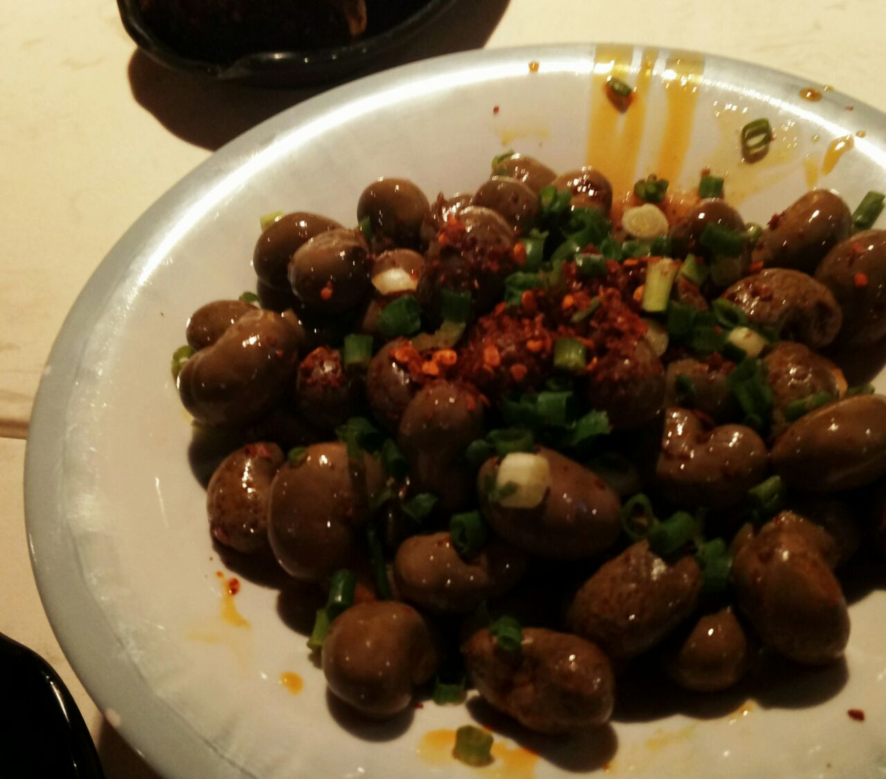 现做的卤兔头果然跟真空包装的兔头完全不能比,味道真是天壤之别,比我想象中的要好吃多了。五香和麻辣两种做法各有各的滋味,而这家双流老妈兔头,味道确实还可以,作为小酌一顿的聚餐地倒也合适。 这家跟旁边的伟伟鸭脑壳是连在一起的,兔头和鸭脑壳不妨都试试。开张时间不短了,所以环境上还是有点大大小小的问题,比如地板非常油腻,走路要特别注意,一个不小心就要滑一下。而厕所也只有两个男女通用的单人间,吃饭高峰时间就有的折腾了。 不喜欢太辣的话,五香兔头是个好选择。卤的很入味,但是没有过咸,味道偏温和,啃着比鸭头好吃多了。麻辣兔头是个下酒好菜,味道劲爆,啃起来的那种辣味能持续很久,麻味和辣味并重,吃完之后舌头还能麻嗖嗖很久。 相对于兔头,兔肾的味道一般般,吃着有点偏寡淡,外加兔肾也有点偏老了,略微遗憾。 其他各种菜品中,最亮眼的就是牛蛙了。虽说是干锅的做法,但是用北京铜火锅作为盛器,里面还垫了炭,立体式的加热让牛蛙会越吃越入味(因为汁水都开始被收缩了)。不过也不能吃的太久,不然牛蛙就会变得很老。各种蔬菜类品种很丰富,如果作为双人餐的话,一个牛蛙一叠兔头,外加一盘素菜就足够了。 章鱼就比较一般般了,铁板的做法让章鱼足吃着很老,有点偏橡皮圈的那种口感;而大量的辣椒像是点缀摆设,并没有把辣味渗入到章鱼中去,可以不用点。 肥肠作为凉菜,味道也不错。其实吃过五香兔头之后就能感觉出这家的各种卤味都有几把刷子,都不会太难吃,可以放心大胆的点着好了~