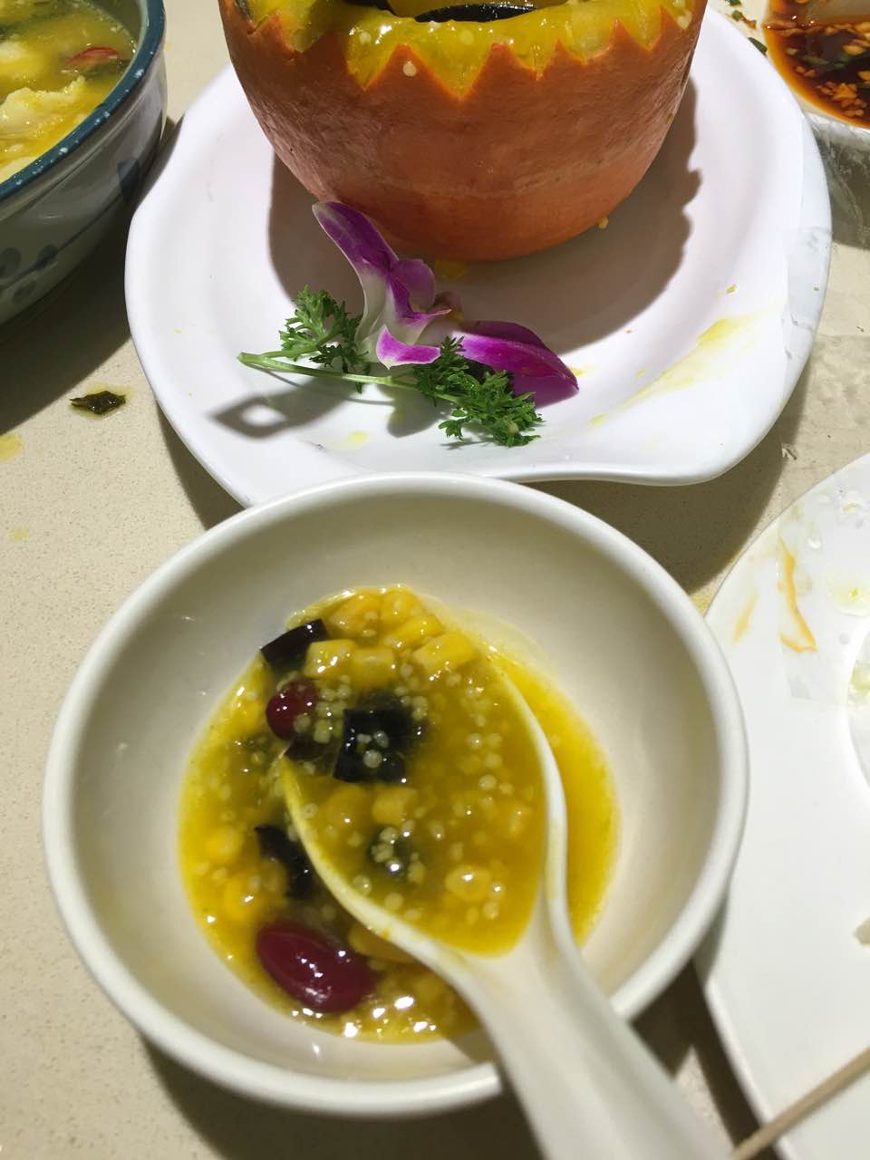 拦住付现金的老娘,一定要用支付宝付给个差评,太难吃了,无法形容的难吃。图片上的,老娘说“皮蛋煮的挺烂”,然而是海参,而且是咸粥,简直黑暗料理,说是特色菜?酸菜鱼完全不酸不辣,非常闲。豆豉鱼什么的也不知道是什么豉油,跟没放一样,解释说是酱油。总之菜味就像是徐州的厨师用广东粤菜的做法做了一桌川菜。非常清淡的口味,可能有人喜欢,但我们真的吃不惯,绝对不会再来了。