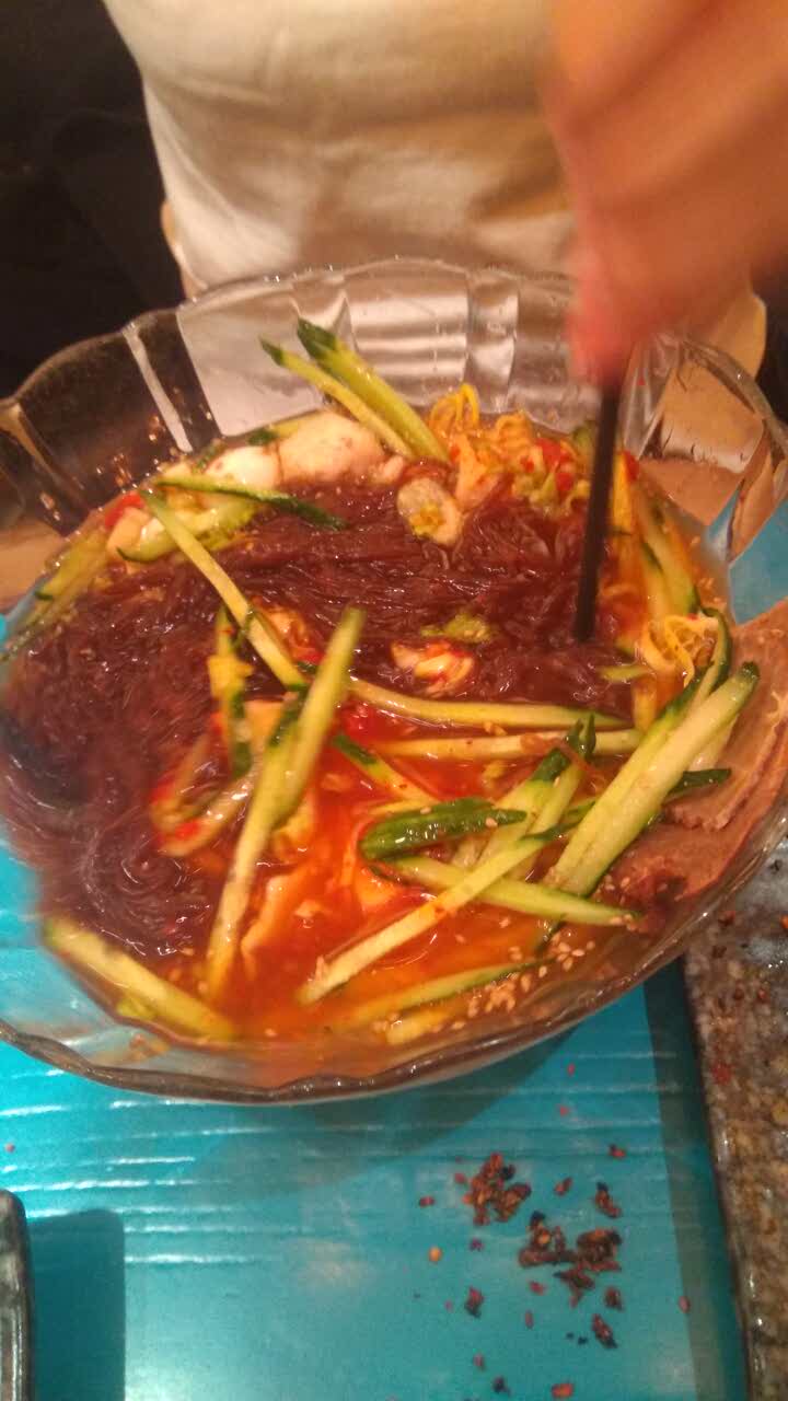 冷面味道不错,羊肉串一般,土豆片不推荐,个人喜好点石锅要加一份芝士