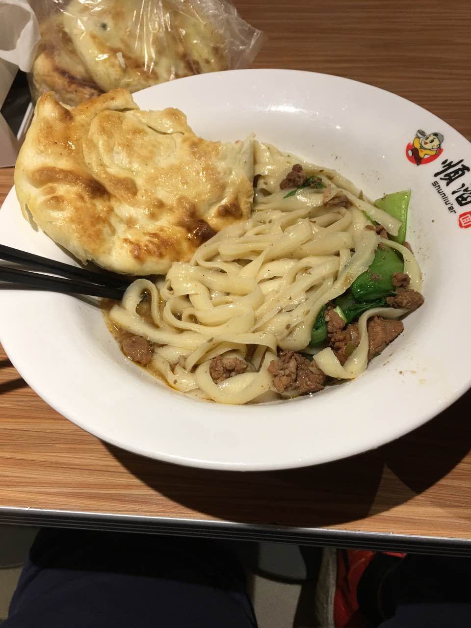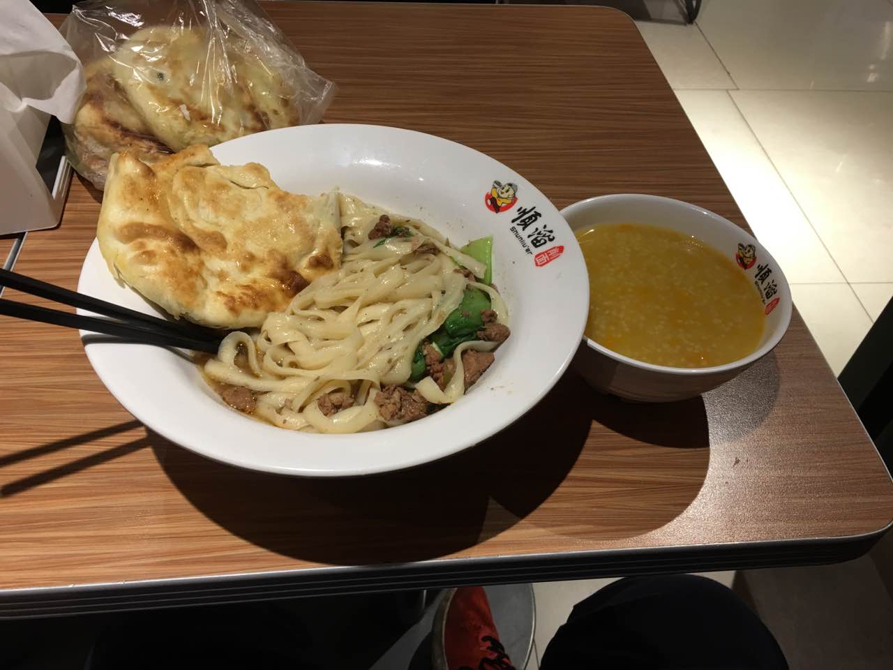 猪肉面,自己带的饼,送的南瓜小米粥,一个人吃够够的了,喜欢吃刀削面,开动!