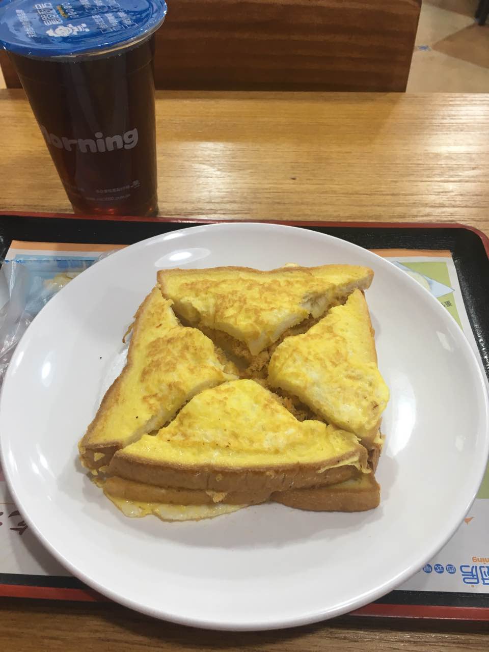 喜欢上晨间厨房,是从“享受晨间.品味生活”的slogan开始的。走进晨间,环境明亮、舒适,每一个服务员热情友善,餐点更是每一款都超爱的,今日的法式肉松,土司裹蛋煎至金黄香味诱人,加上肉松的松棉,真是不能再赞了。搭配古早味红茶,偶滴最爱。推荐推荐。