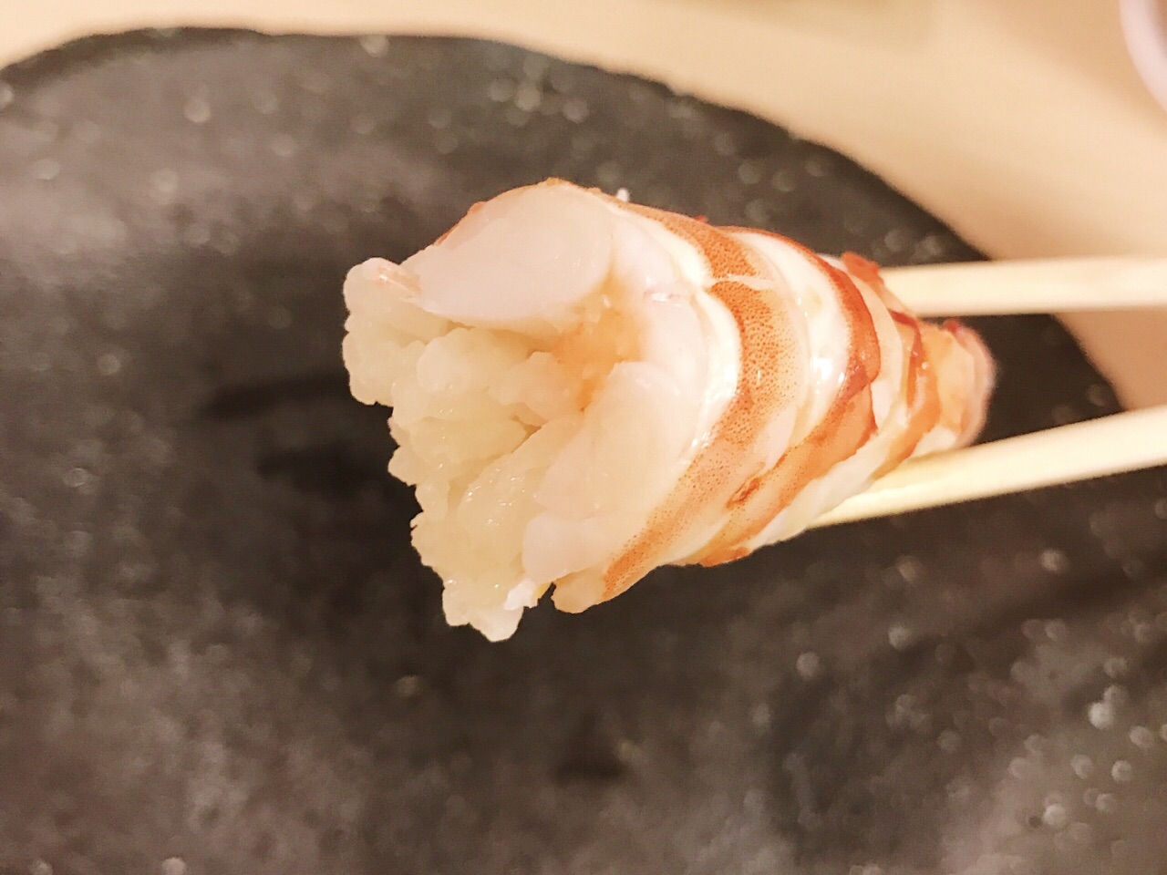 再推荐一贯有趣的寿司--对虾寿司,外表看似很普通,但是实际上完整的虾肉里面还包裹了一层虾肉的肉...