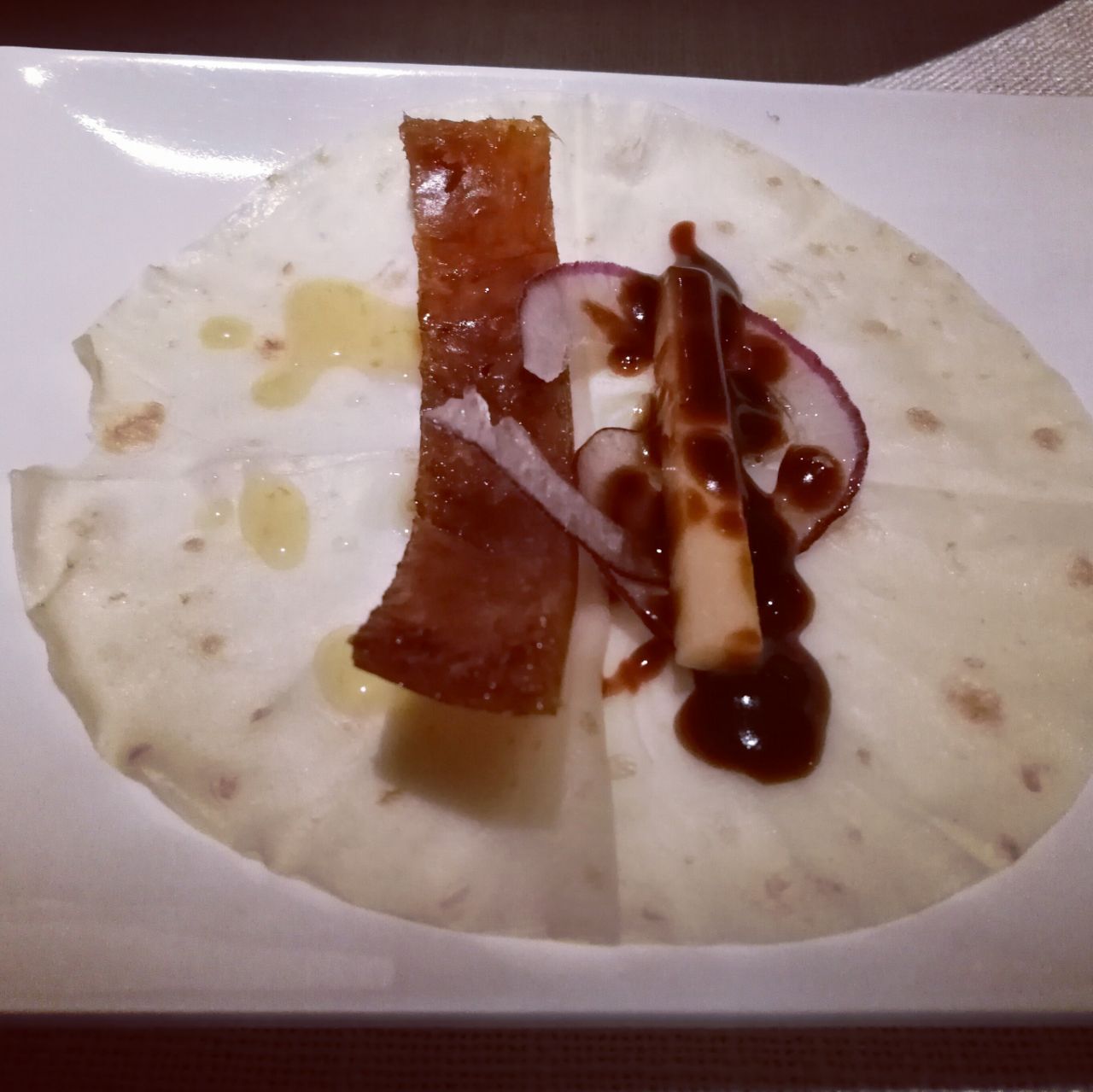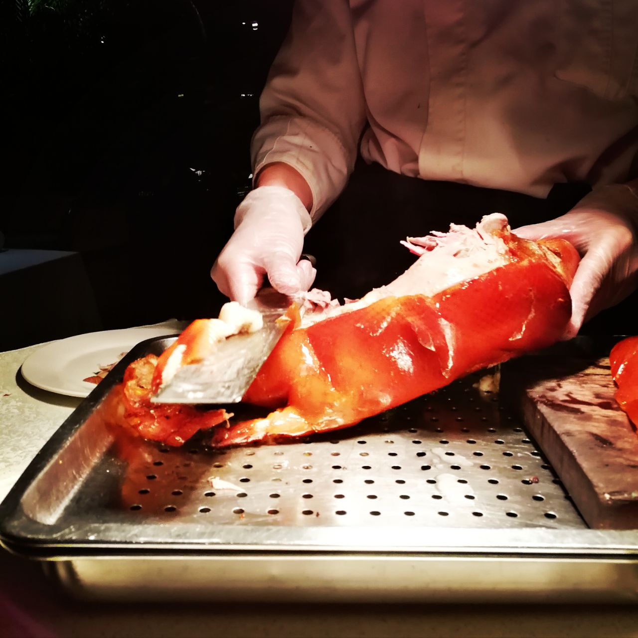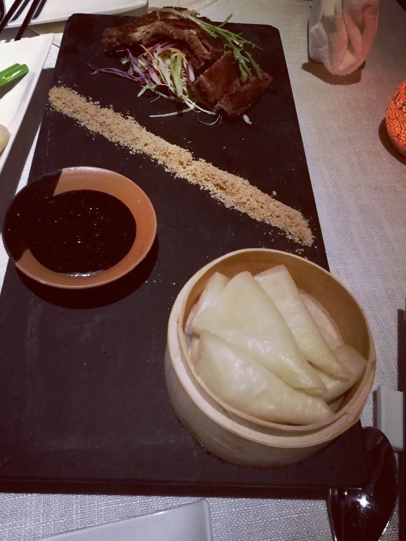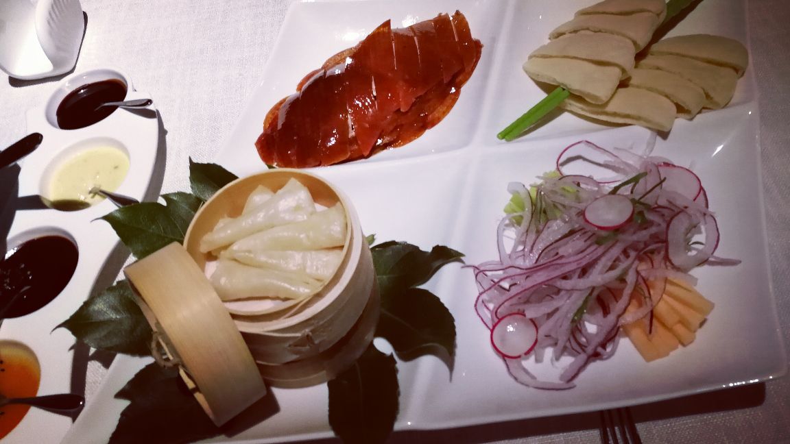 ...是北京城最好吃的烤鸭之一,色亮皮酥肉嫩多汁,四种酱料口感丰富,饼皮很好折成一小点展开也好不费劲