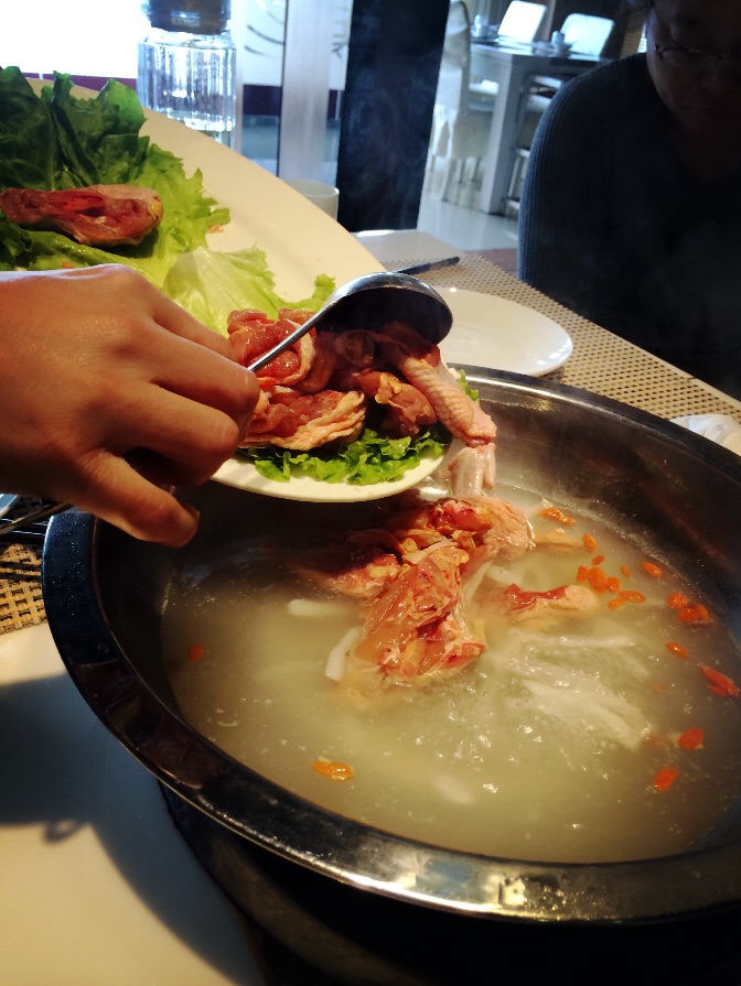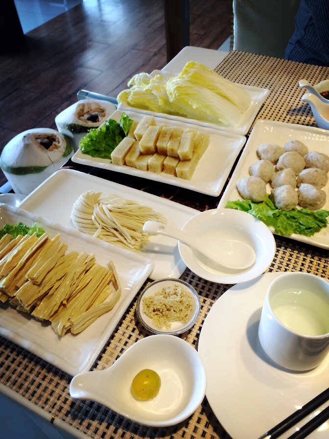 国信体育场里边,只能听导航了,好在停车️还是方便的。 没吃过炒菜,看大家都说还不错。 来吃的是号称岛城第一家#椰子鸡#,顾名思义,整一个椰子的汁水倒入随汤,再倒入鸡肉焖煮,开锅后就能再涮其他菜品啦…… 吃个新鲜还可以啦,就是鸡肉好快烂的,肉食鸡的设定,汤微甜也不是我的口味。 蘸料可以挤金桔汁,以酸调甜。 南方过来️口味么,北方人接受度上可能还需要调整,但是概念还是很好的,突然让我想起了榴莲鸡,可能我还是会选择挑战这种菜品的~~
