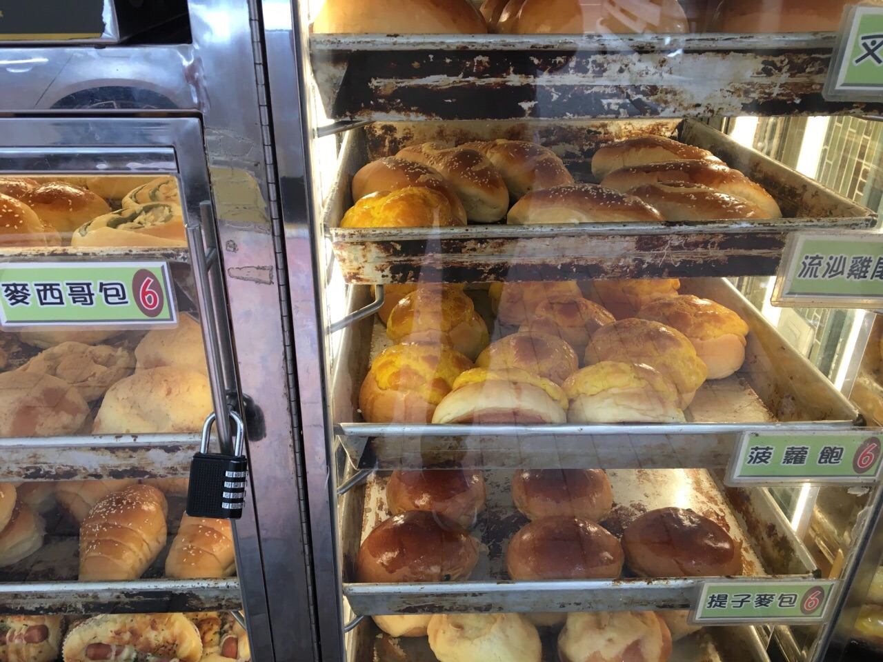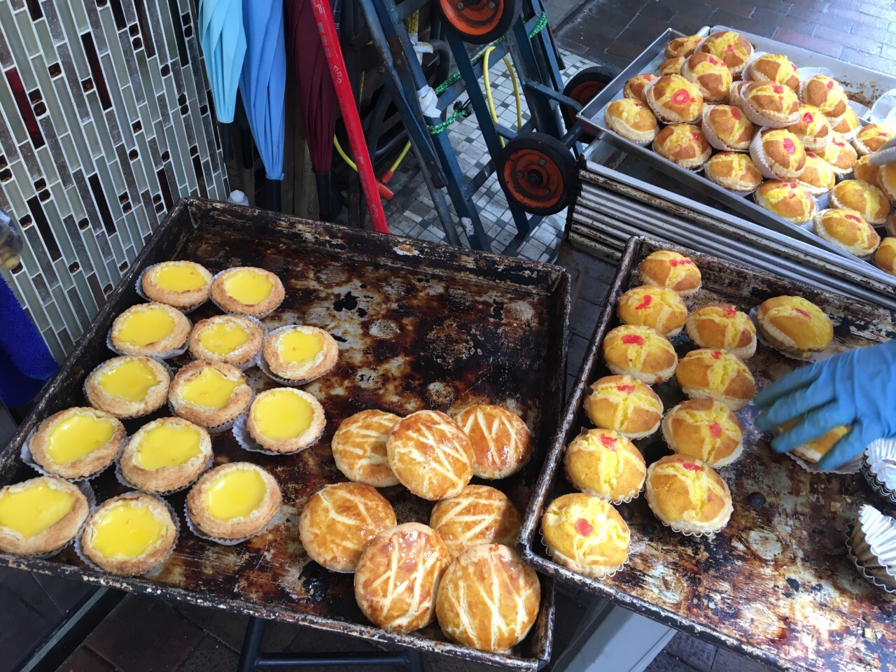 九龙餐室最为著名的是菠萝油,而且是特大菠萝油,另外还有大份量的西多士。其实不用进到餐厅里面,在餐厅外的橱窗里就能够买到这些外卖的面包、沙翁,、鸡批、蛋挞、老婆饼,大约都是港币6到7块钱左右。刚好路过的时候,看见正在新鲜出炉,瞬间就卖到零零落落只剩下几个了。