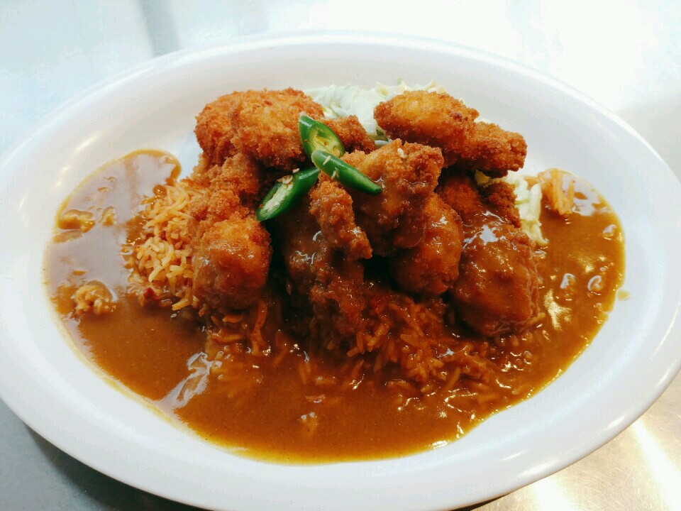 Breaded oysters curry rice plate with spicy rice. The oysters were super delicious, but the rice wasn't spicy at all and was way too dry.