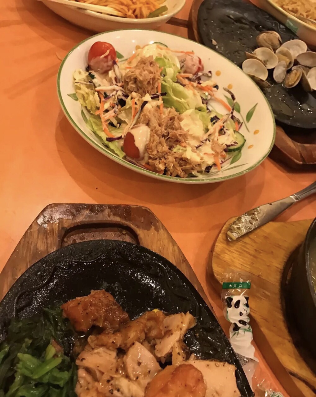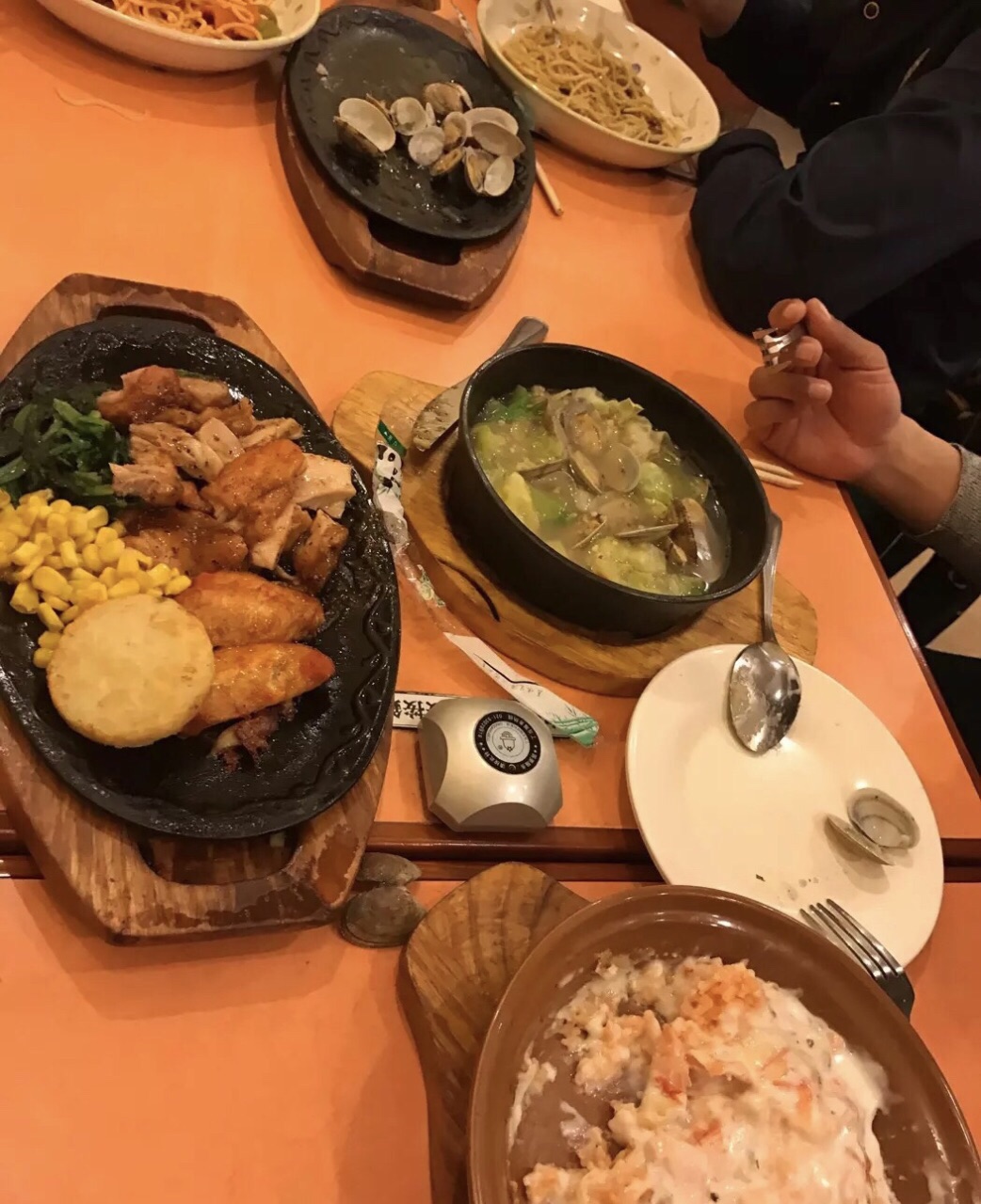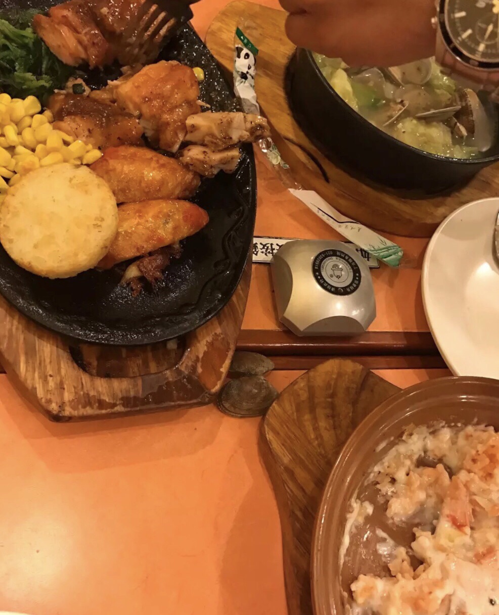 今天人不少,但是还有位置,点了好多,金枪鱼沙拉,番茄培根意面,黑椒意面,三文鱼饭,烤花蛤,花蛤汤两份,海鲜考饭,鸡翅配鸡排,比较喜欢番茄意面,孩子就爱吃面,每次都会给她点面,鸡翅有一点辣,不太像奥尔良口味的,鸡排不错,肉很嫩,很好嚼的,花蛤汤,花蛤很鲜,汤味道有点重,也许是个人口味偏淡的原因,吃完饭喝了好多水,海鲜考饭就是大虾和鱿鱼圈,底下是米饭,这个饭吃了好多次了。三文鱼饭鱼肉米饭芝士无敌搭配,孩子可以吃。每次只要不知道吃什么就选萨利亚。还有筷子,很方便。
