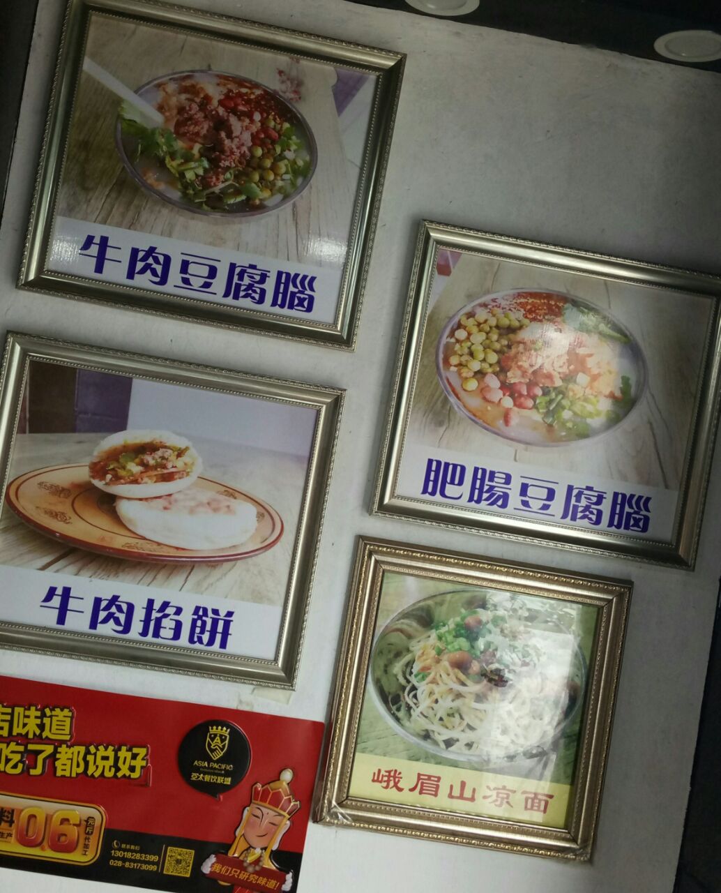 匆匆从地铁出来后瞟到这家峨眉山豆腐脑生意不错,因为急着去鲜知味抢钵钵鸡,所以没怎么注意看。100秒后发现钵钵鸡没开门,大妈们还忙着串签签,于是跟大妈打过招呼之后,果断折回来吃豆腐脑。 进来之后发现这家生意不错,很多本地成都人都来这儿吃豆腐脑——瞬间妥当,心理有底了。店面不大,五六张桌子,主打各种豆腐脑和掐饼。掐饼看着像是白面锅盔里面塞牛肉,因为事先在严太婆锅盔店里吃到很尽兴,所以这顿就专心吃着豆腐脑。 点的鸳鸯豆腐脑,10块一碗,分量不多的一小碗,但是里面的粉蒸肉和肥肠很实在。味道不算惊艳,但是吃着很满意,不管是豆腐脑本身,还是肥肠、粉蒸肉,抑或是配菜里的青豆,都没什么太大问题,呼啦一碗三下五除二就消灭完了,真是让人舒坦的小吃啊~ 先说说粉蒸肉,很实在,肉不少,跟米一起调和的比例很好,搅拌之前不妨先吃上一筷子粉蒸肉;再来说说肥肠,红油里面稍稍浸了那么一会儿,口感爽脆,也挺喜欢。 等尝完粉蒸肉和肥肠,就可以安心搅拌一下,享受融洽的豆腐脑,隐隐约约的辣味不明显,甚至额头都不会出汗,吃着让豆腐脑不会过于清淡,而炸到香脆的青豆,和柔嫩的豆腐脑这么一搭配,反衬明显反而意外的不错~ 其实很想试试这儿的酥肉豆腐脑,临走前才想起。。。其实可以跟老板打个招呼,在鸳鸯豆腐脑里加一份酥肉,更豪华的配置感觉会更好吃一点,有兴趣的吃货们不妨一试~