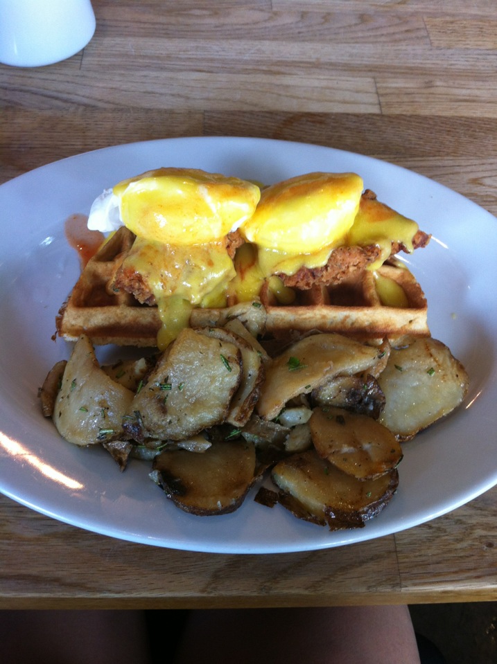 If you want to leave happy, get the chicken and waffles benedict! The flavors are unbelievable with the sweetness of syrup, the savory taste of hollandaise, and kick of spice at the end. Get it!