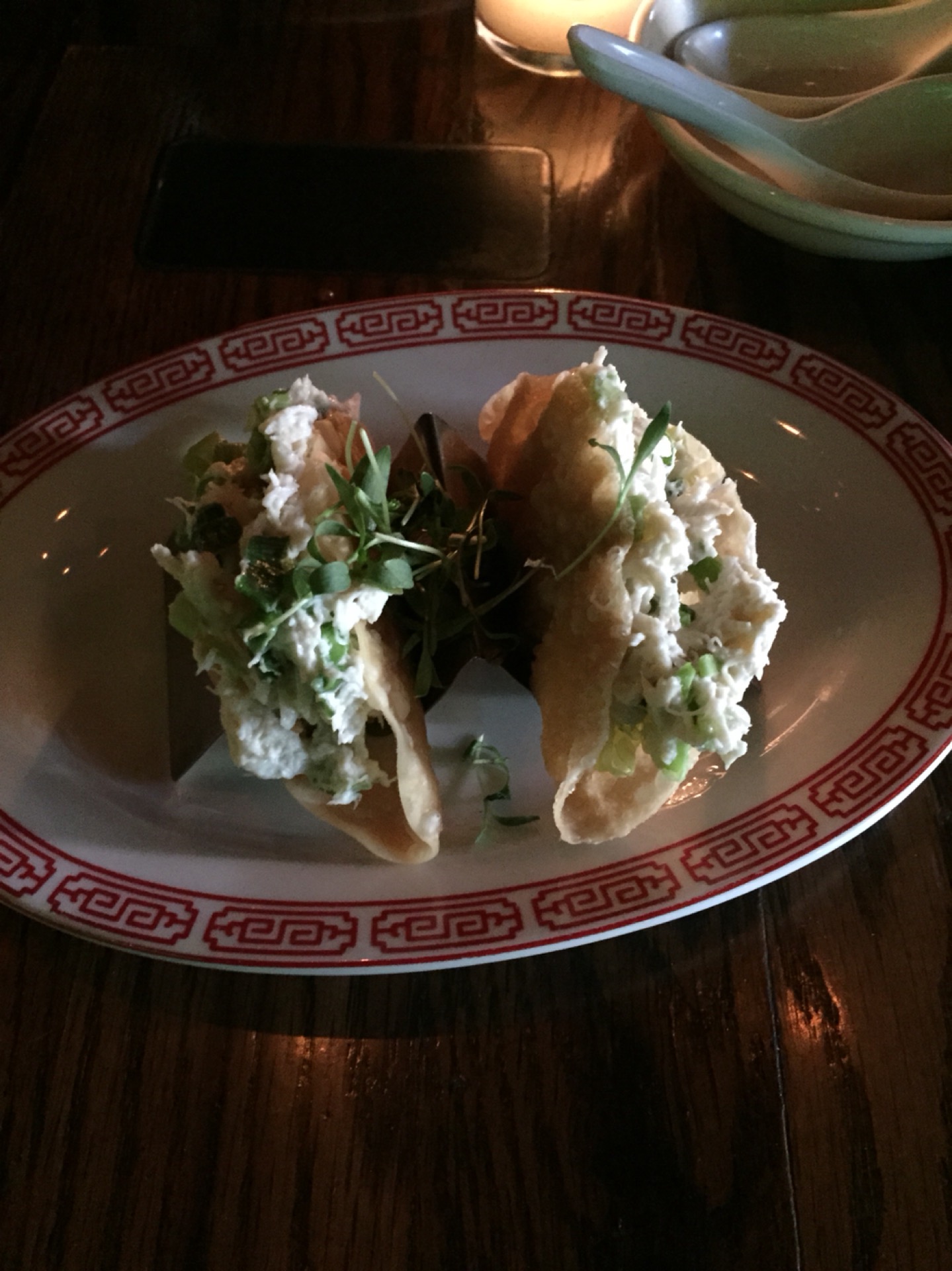 Modern Asian place with "urban" decor. Get the chefs tasting menu for first time visitors! Best deal!! Edamame dumplings all the way!!! Below is crab tacos