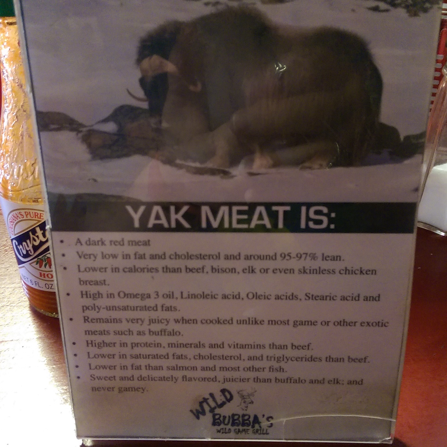 Try the Yak, the wagyu, elk, and kangaroo burge...Try the Yak, the wagyu, elk, and kangaroo burgers. They are all wonderful!