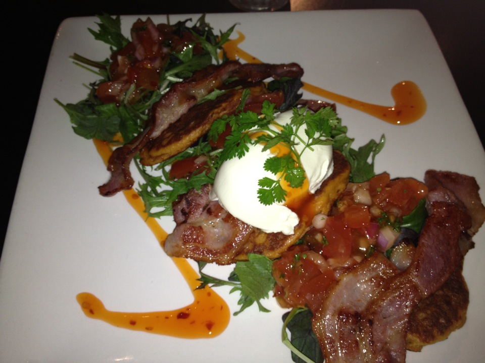 Corn fritters n bacon. Pricey but delicious