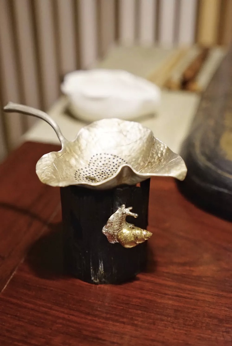 然发现了茂名南路上的上海文化广场 广场上早已披上了成片金灿灿的外衣 游人较少 场地宽阔 随手一拍都是风景 广场的一处隐匿了一家品茶兼用餐的十二间·山 穿过竹林深处 曲径通幽的小道 这里不似城市的喧嚣 仿佛进入了另一处世外桃源 进门处别致的花艺 桌上点上了淡雅的香薰 赏花逗鸟 别有景致 跟随穿着素雅的侍者随楼梯上二楼 空间之大 感觉别有洞天 如店名相同 共有十二间独立的包间 六间饮茶 六间用餐 最多同时接待六批客人 以保证提供最周到的服务 花雨云湖山林 人乐尘世心净 每个包间都有自己的专属名字 取自于图中的这幅对联 花雨云湖山林 人乐尘世心净 我们被安排在净间 包间灯光昏暗 均为木质结构的圆弧形 私密性不够佳 好在品茶时轻言细语 无喧哗之感 茶艺师随后到来为我们泡茶 从温具 置茶到冲泡 茶艺师都会与客人互动 沟通 今天享用的是一款炭焙铁观音 闻起来具有浓郁的碳火香味 夹带一股奶香 茶泡好之后 其颜色如琥珀 端杯时能闻到一股清香 细滑入喉 入口回甘 品茶之时不能缺少了中式点心相伴 各款动物 水果造型 栩栩如生 绿色款的糕点更接近传统口味 饼皮薄 内陷细腻不甜 精致可爱的小猪和青苹果 苹果的叶子点缀了不同的色彩 惟妙惟肖 精致可人 油炸的花生酥新鲜出炉 连内陷都是花生味 外层油香酥脆 尝一口花生酥 配上铁观音 解腻清爽 搭配甚好
