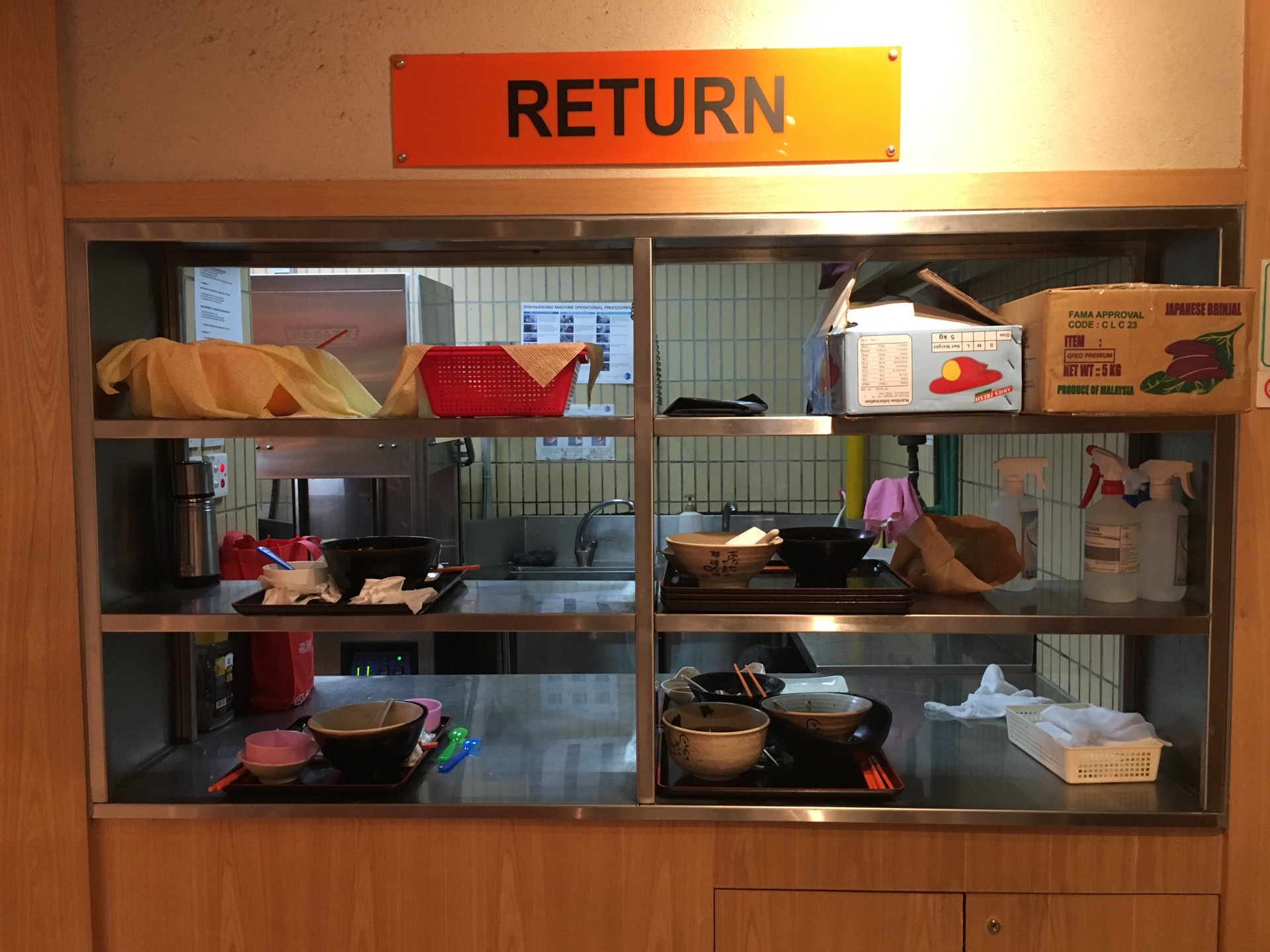 Clear your table after the meal. There's a "Return" shelf inside the restaurant for you to place your used cutleries