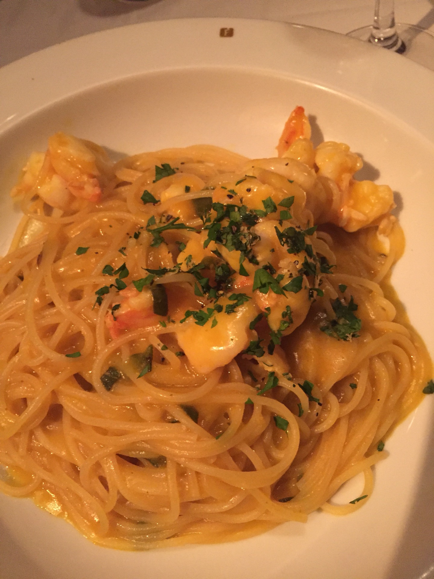 Espaguete com creme de limão e camarões, muito bom, mas para o meu paladar estava um tanto ácido... o atendimento do restaurante é exemplar!