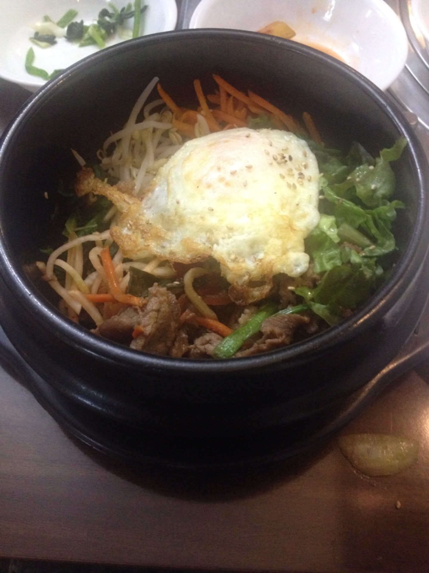 El dolsotbibimbap te deja satisfecho y es una excelente combinación de sabores. Hay que revolverlo todo con la cuchara y después comerlo. Ü (un poco picante)