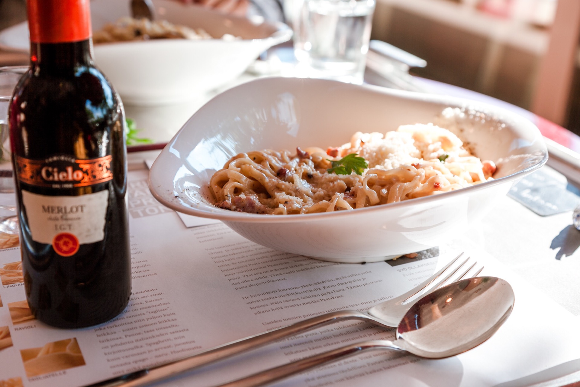 good pasta in cozy terrace both lunch and dinner. if my memories were correct, it was under or around 20euros for pasta and wine.
