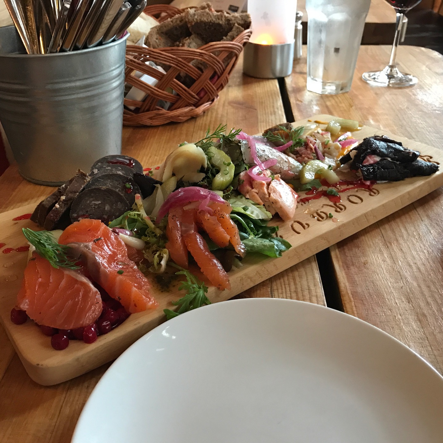 Great sharing starter of local delicacies and a great mains of different local meats. 1 starter, 2 mains, 1 wine and 2 drinks cost £100 with the 10% oslo pass discount