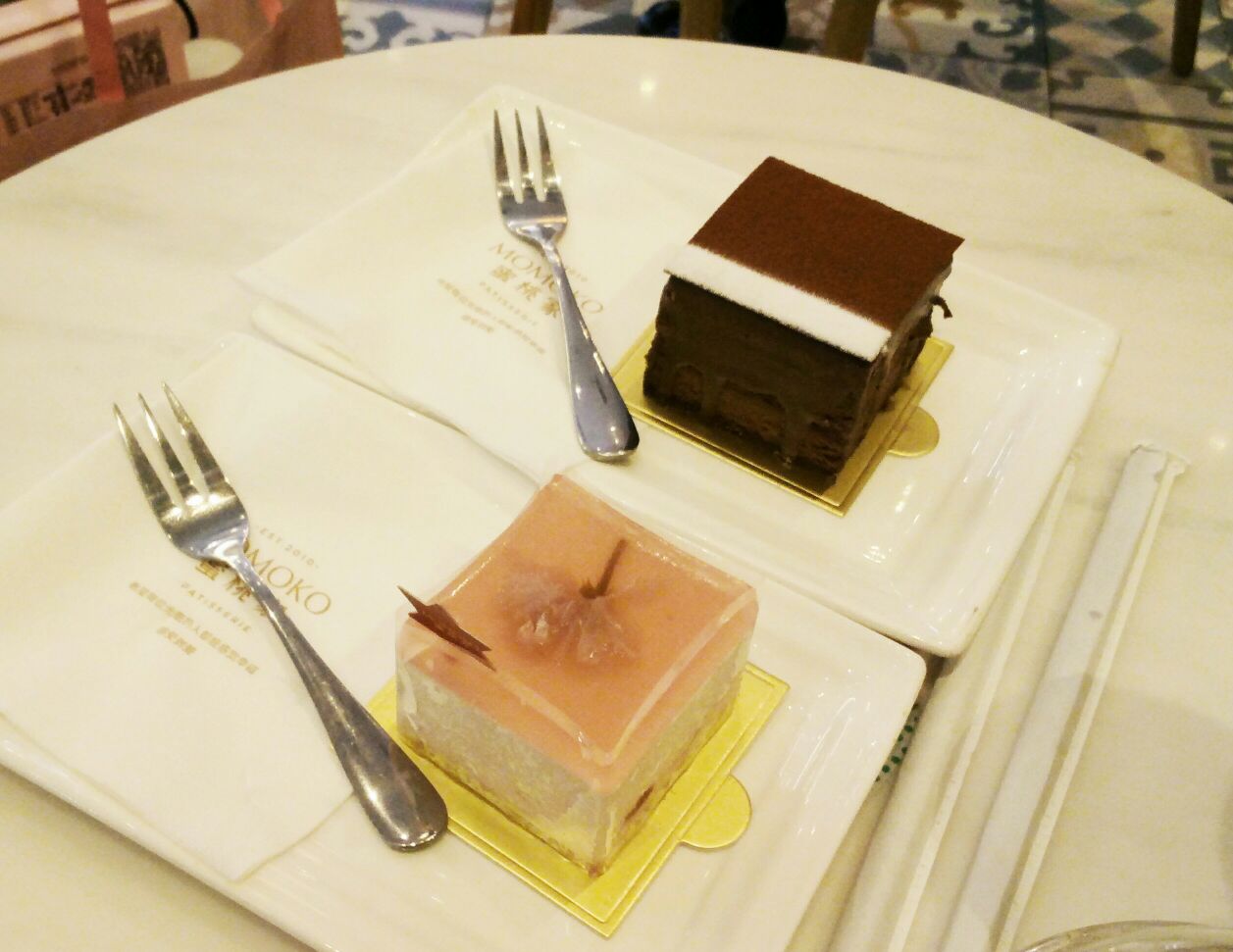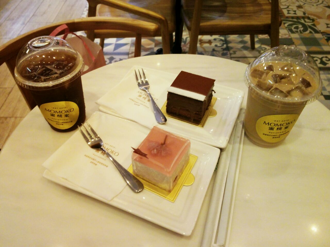MOMOKO蜜桃家好像最初是以网店来发家的,成了火热网红之后在市中心开了实体店来扩大名气和提高食品安全性。 远洋太古里的这家分店很好找,就在地下一层ole超市的隔壁,电梯下去拐个弯就到了。实体店地方不大,氛围简约干净,小饰品和墙画增加了一些时尚氛围,除了位置过于幽闭没有室外座位外,其他都没什么太大问题。 品种比我想象中的要多,近二十余种甜品基本可以满足绝大部分慕名而来的少女心。特别是新款甜品——蜜桃,做到逼真的外形,远远看过去真心很像一只多汁的水蜜桃,模样真心很美~ 招牌的酒味慕斯蛋糕——五粮酒黑方,口感名不虚传,糅合酒香的甜蜜滋味轻而易举的征服了嗜甜的酒鬼,口感比酒心巧克力更加升华。 这款蛋糕是以黑巧克力蛋糕为基础,蛋糕胚和巧克力酱带来的不是一味的甜腻,而是颇有层次感的各种巧克力差异,最上面那层才是渗入了五粮液的巧克力涂层,外部覆以巧克力薄片和巧克力粉,把酒味儿轻巧的锁在了最上层,保证味蕾的第一时间接触,让我真心喜欢。 另一款樱花慕斯是从日式玄饼中变化而来,增加了口感轻盈的芝士底,口感先是清爽后是甜腻,相对来说比其他款甜度要低一点,当然对我来说还是太甜腻了点——可惜无奈这儿的甜品款总体都是偏甜口感。 咖啡一般般,属于喝完就毫无印象的那种,门口的冰淇淋柜台让人颇有吸引力,甚至还有浓度到达120[%]的信长冰淇淋球,号称是宇宙最强浓度,非等闲之人难以销售~