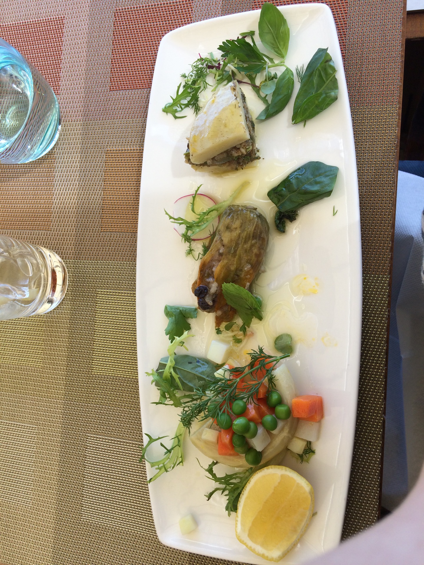 The view is as great as the food! Fresh and beautiful try the vegetarian starter with zucchini flowers and artichoke.