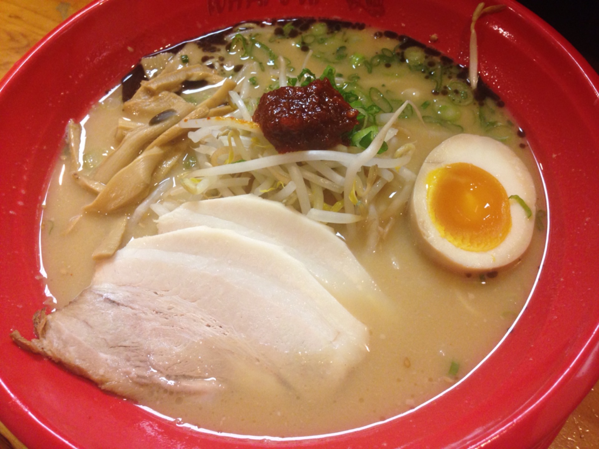 Red ramen (spicy) is a little better than Tonkotsu (salt) one. It's still a little too salty for me, but not bad.