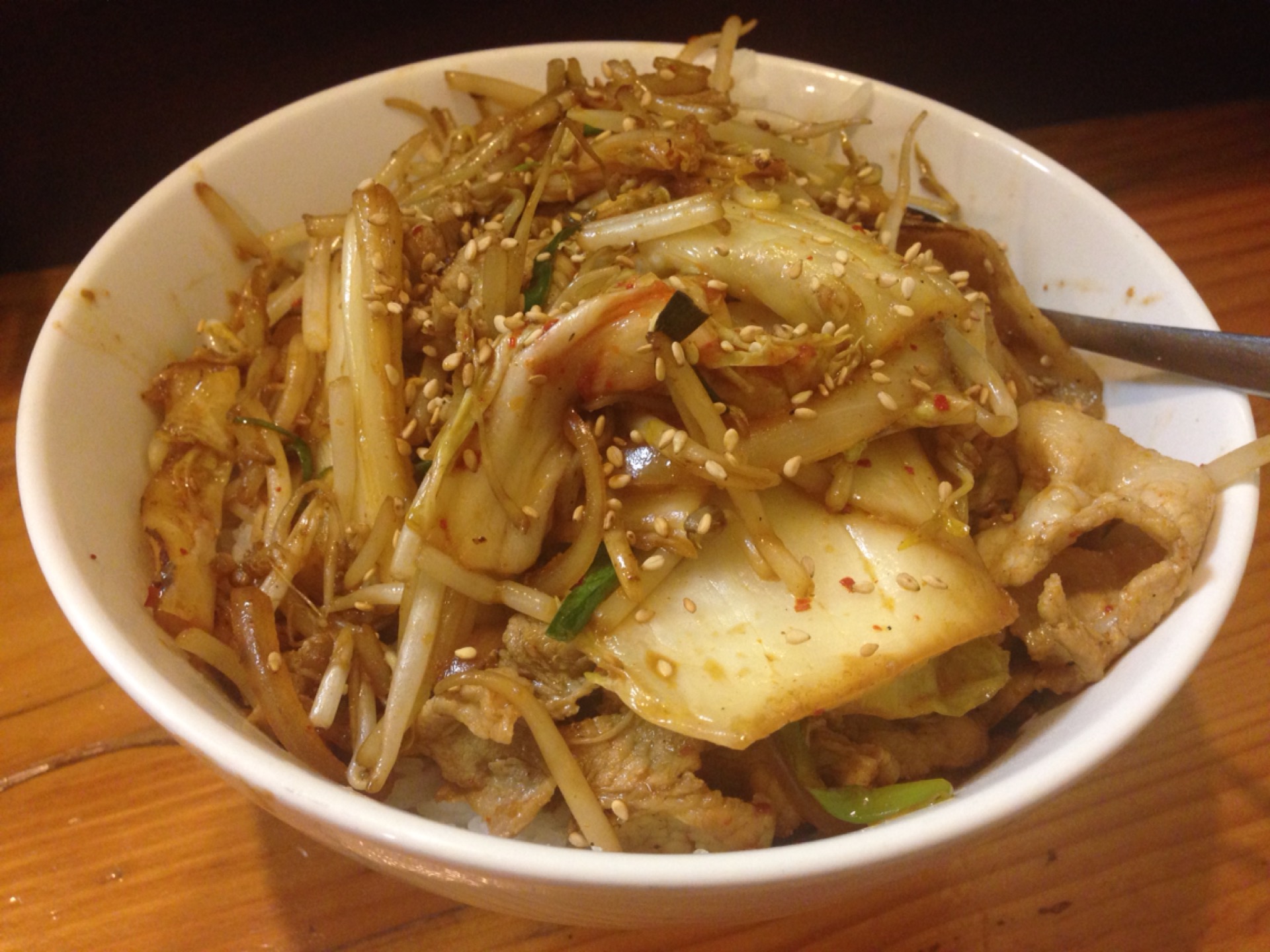 Buta (pork) kimchi rice bowl: lots of bean spro...