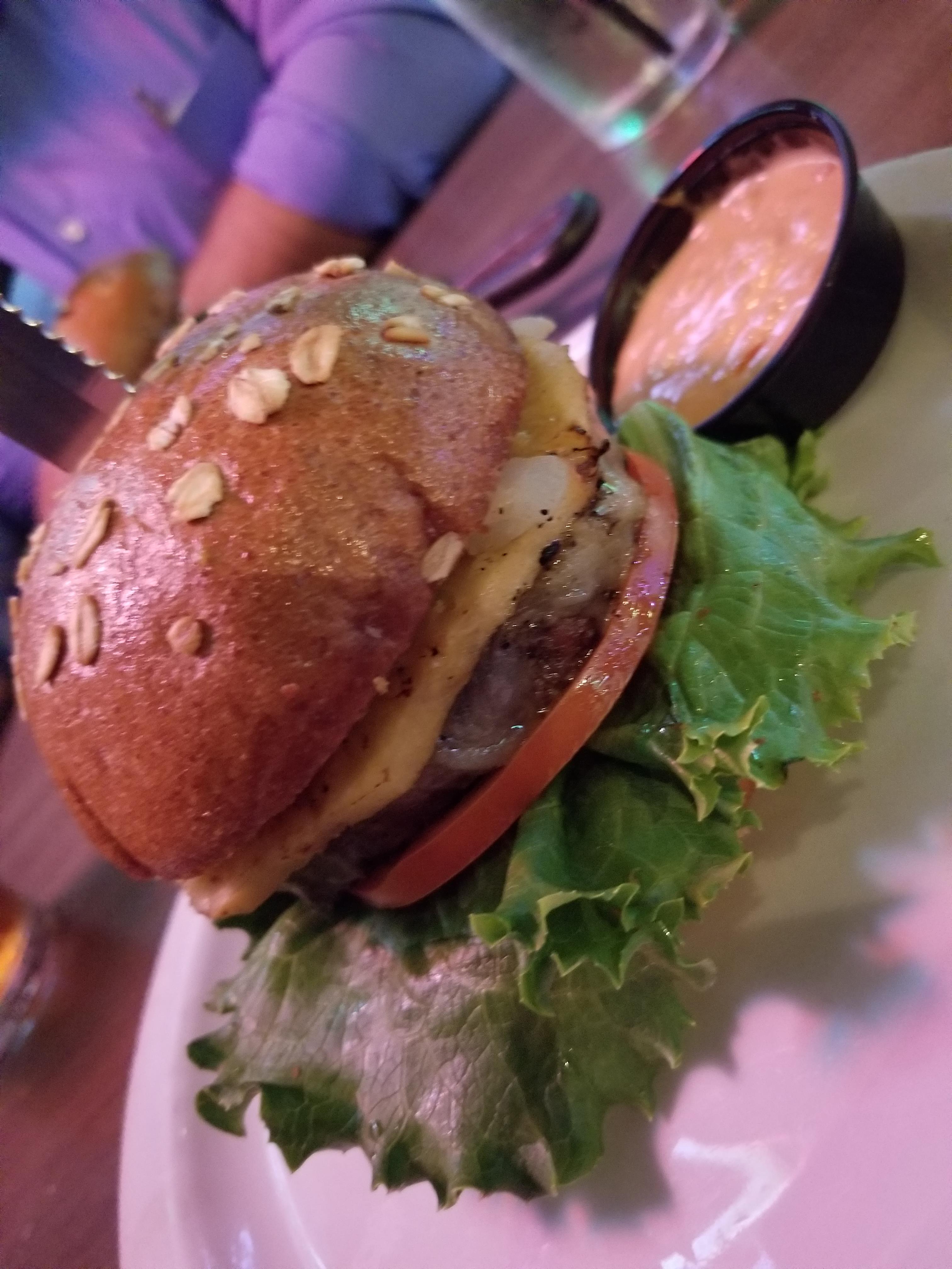 I had my own creation: 50/50 beef and bacon, on a wheat bun, pepper jack cheese, grilled pineapple and onions, lettuce and tomato, bbq sauce and bacon island on the side.