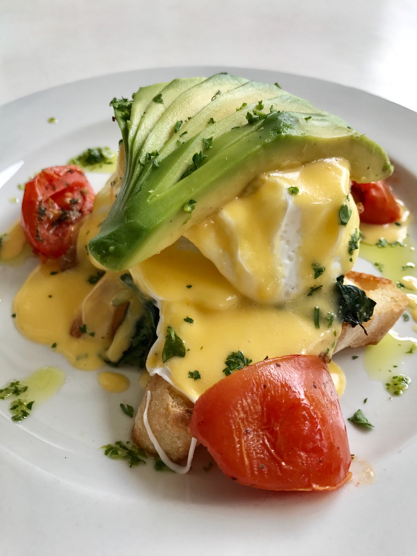 The Eggs Benedict are fabulous. They come with either mushrooms or bacon but you can ask for avocado instead.
