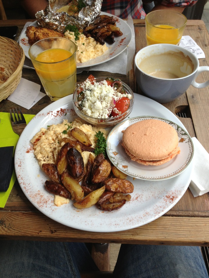Amazing place with great brunch. Bread, juice + choose 4 items between eggs, potatoes, feta salad, chicken, sausages, salmon, champignons, tomatoes... And even macaron! Only€14, great value.