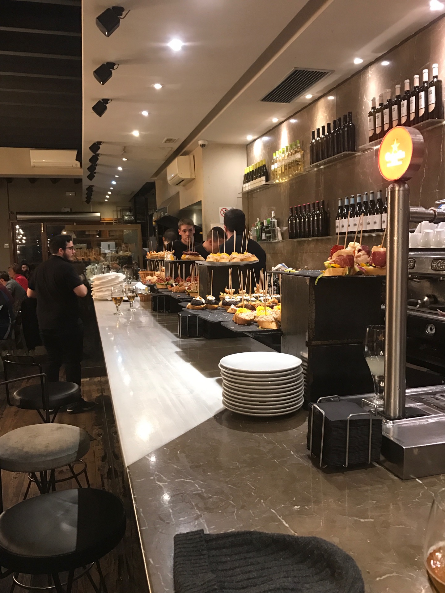 Very lively place with superb pintxes (mostly canapés with dressings like tuna salad, peppers filled with crab salad and delicious iberíco ham. A very nice place for an early evening drink.