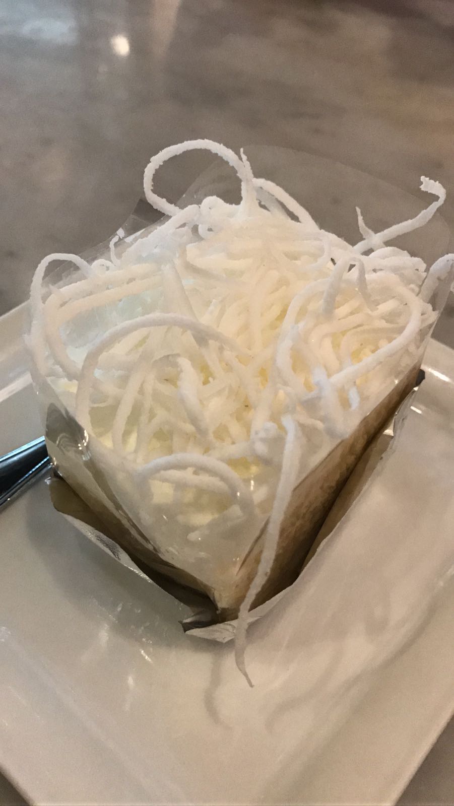 Coconut cake is awesome! Fluffy sponge, young coconut flesh in middle, topped with light coconut Chantilly creme and finished with some fresh crunchy coconut ❤