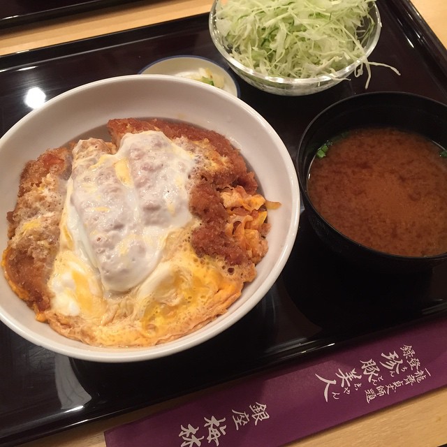 カツ丼にキャベツをつけました。味噌汁が赤味噌でホッとします。