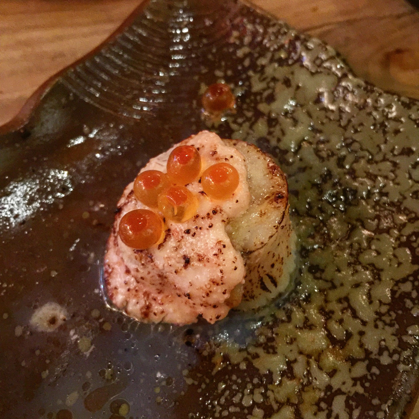Ordered grilled scallops mentaiko (3 for $11), ...