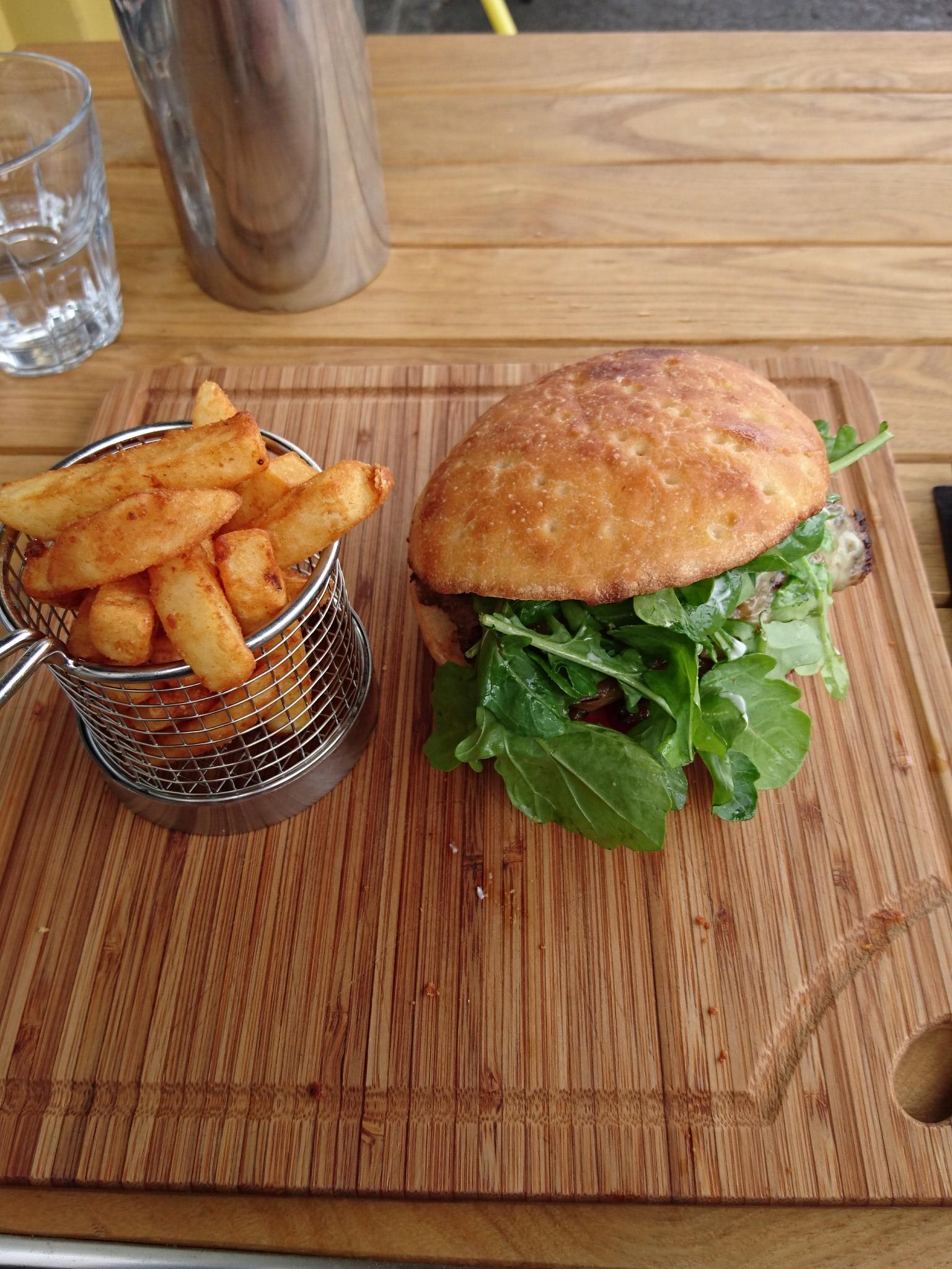 Despite being served on a breadboard, the wagu beef burger was amazing. Included beetroot and delicious caramelised onions. Great coffee too.