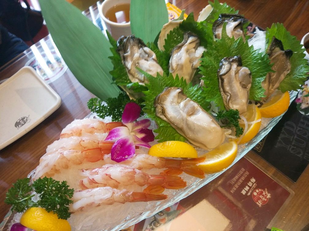 抽中大众点评的霸王餐,和一大帮吃货聚集在友壹町吃日料。周六的午餐客人不少 进店即受到服务员热情相迎。入座貌似榻榻米的卡包,感觉座位不舒服 ,还望店家自己体验一下。陆续上桌的刺身拼盘,法国生蚝肥美,厚切三文鱼很新鲜 一口咬去 软糯的鱼肉在嘴中膨胀开来 充满了幸福感。南极赤海虾Q弹甜糯 。接着是烧烤拼盘 烧冬菇 烧菠萝 烧秋葵 比较喜欢冬菇和秋葵 在蔬菜原味之上又添了烧烤的香味。柚子海鲜沙律和三文鱼鲜蔬沙律高颜值且美味 虾蟹肉和着粉红的柚子多了一份清甜。炙烧三文鱼寿司 炙烧蟹棒寿司 厚切鳗鱼寿司 虾膏甜虾军舰 松叶蟹酱皇帝蟹卷 黑松露海胆酱玻璃虾卷 六款寿司做得非常精美 寿司米饭相当Q弹 最爱蟹棒 蟹肉新鲜饱满味道鲜 鳗鱼粘粘的很入味 。牛油果天妇罗的口感外衣不够脆 作为一家日料店 有待提高。黑蒜油锅烧豚骨拉面 汤头香浓 拉面筋斗 味道不错。铁板芝士牛肉饭 服务员在餐桌上操作 随着铁板的高温 牛肉饭裹着芝士 香味扑鼻 米饭还拉出了丝 引得小伙伴纷纷递上了自己的碗。还有冻红豆抹茶牛奶 百香果芒果茶 鲜榨苹果汁 本人最爱苹果汁 清口。总体评价 友壹町是一家不错的日料店 在天佑城闲逛的日子 推荐友壹町寿司料理!