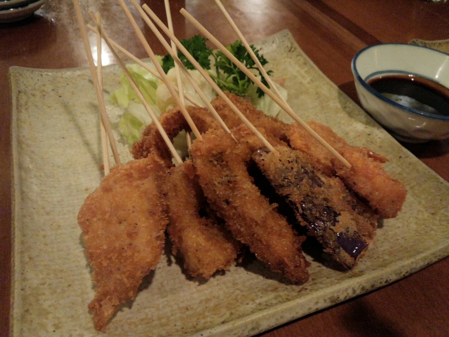 串揚げ盛り合わせ。美味しい!揚げ物に串を後から刺してあるのが惜しい。