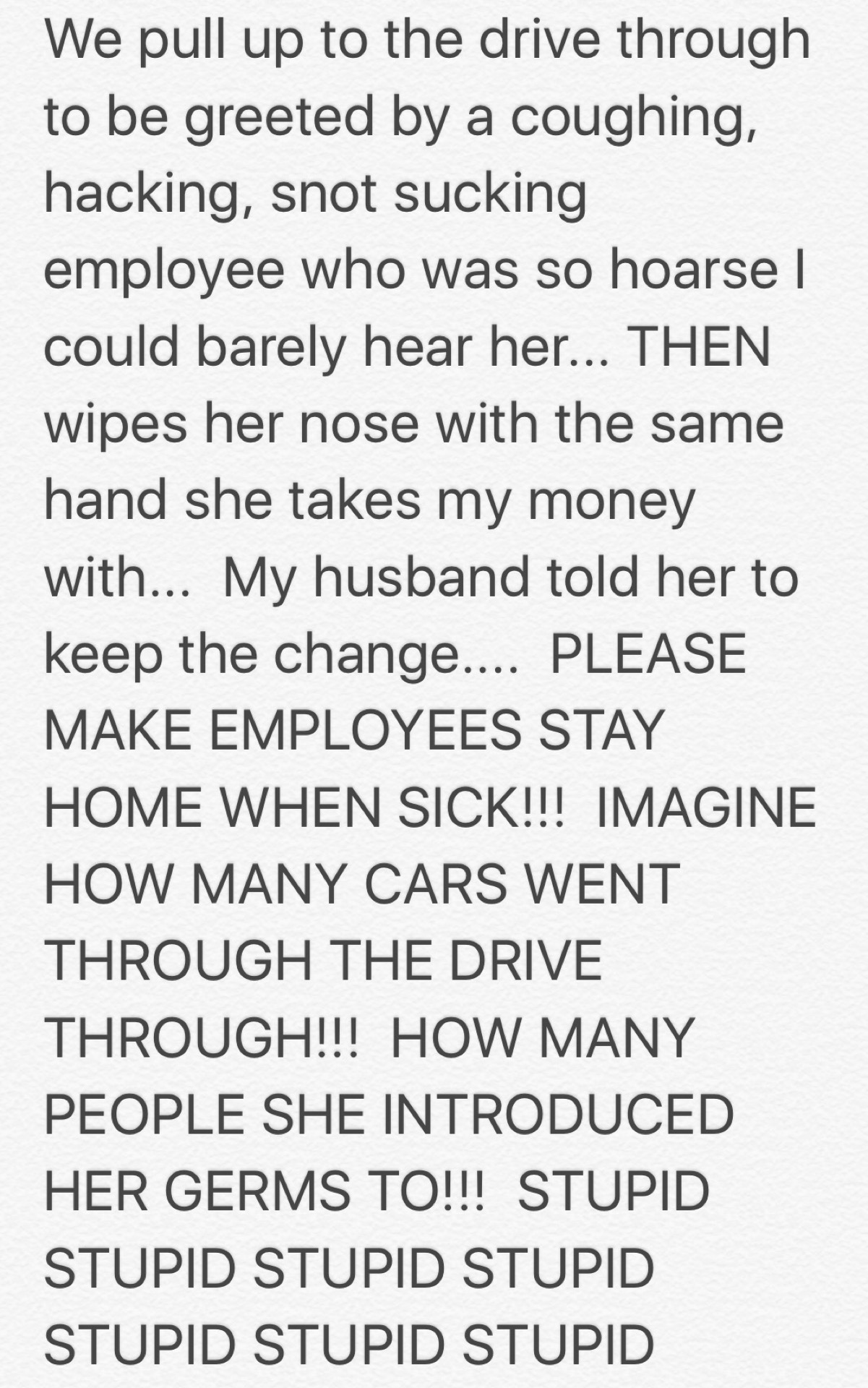 We pull up to the drive through to be greeted by a coughing, hacking, snot sucking employee who was so hoarse I could barely hear her... THEN wipes her nose with the same hand she takes my money