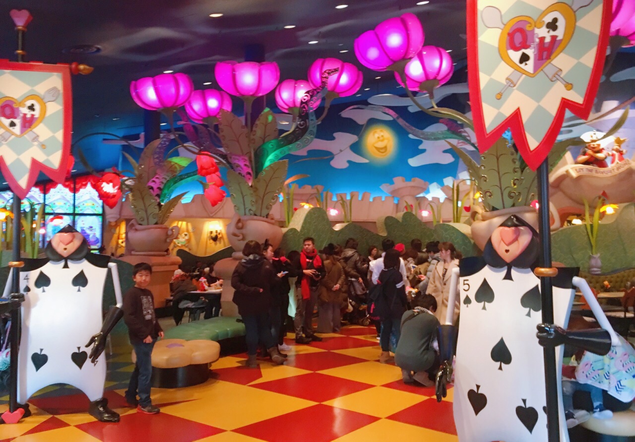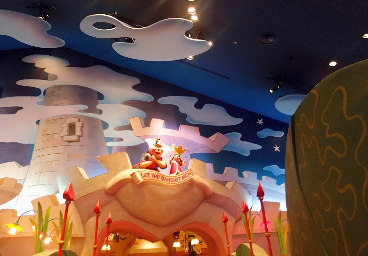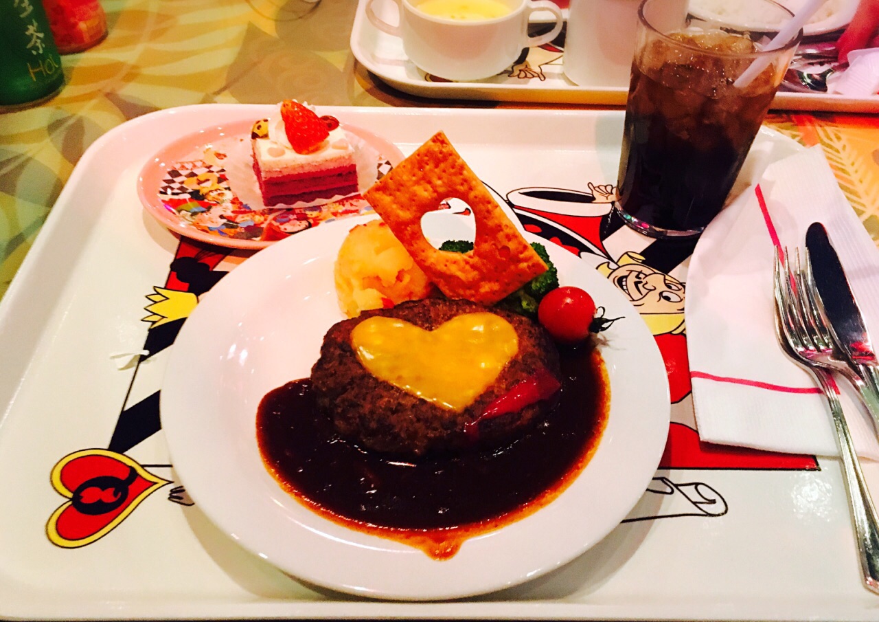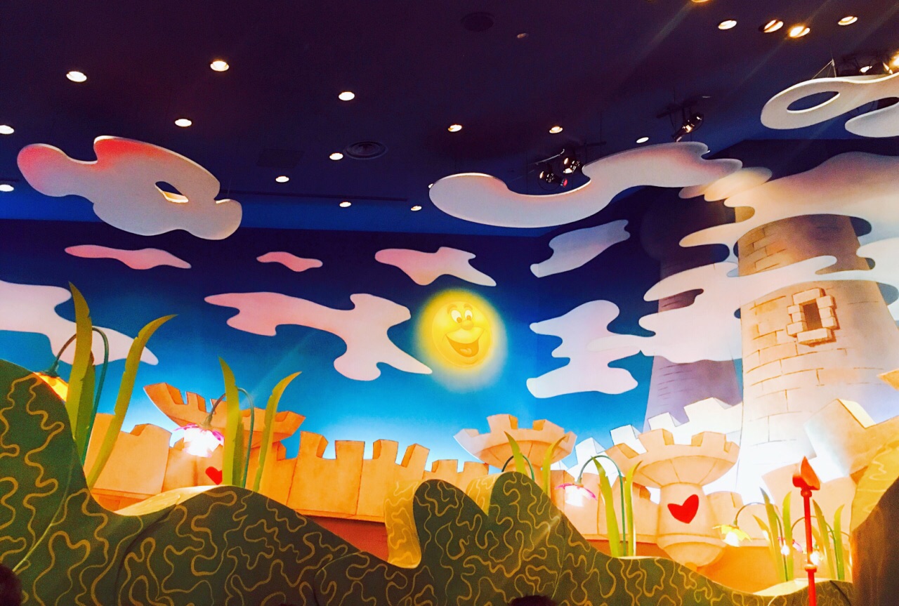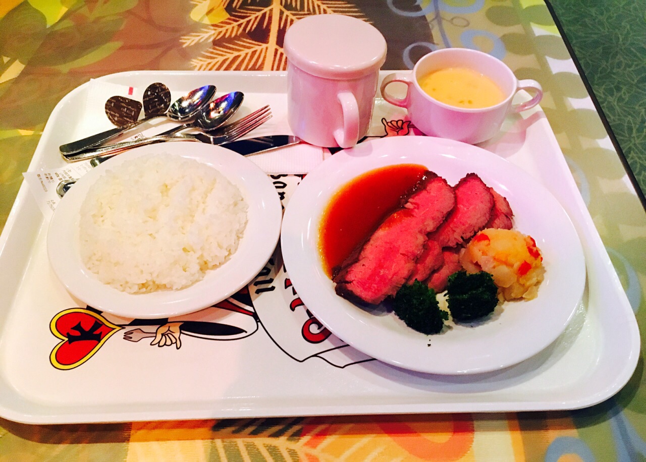 卡通元素非常多的一家餐厅,人气非常旺,充满了童趣,是小朋友们喜欢的风格。 进餐厅的时候需要排队,其实时间并不长,餐厅采取自助式的,先自己拿食物,然后再去收银台结账,取完餐具后,才入座。 先是甜品区,有迪斯尼元素的餐具是可以带走的,结账的时候,会拿到一个打包的塑料袋。然后再是主食,汤品,饮料之类的。 虽然知道我点的红心女王套餐不会太好吃,但是架不住它的颜值啊。味道还好,肉饼是碎肉末做的,谈不上好吃,也能吃吃。相对来说,小伙伴点的牛排好吃一点点。我点的甜品才难吃,奶油不好,腻人,一口吃不进。而且这个盘子也没佩比尔家的好吃。建议大家别点这个。 价格还好,人均100出头点。这家店味道一般,关键是吃环境和颜值的。